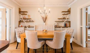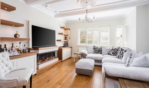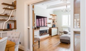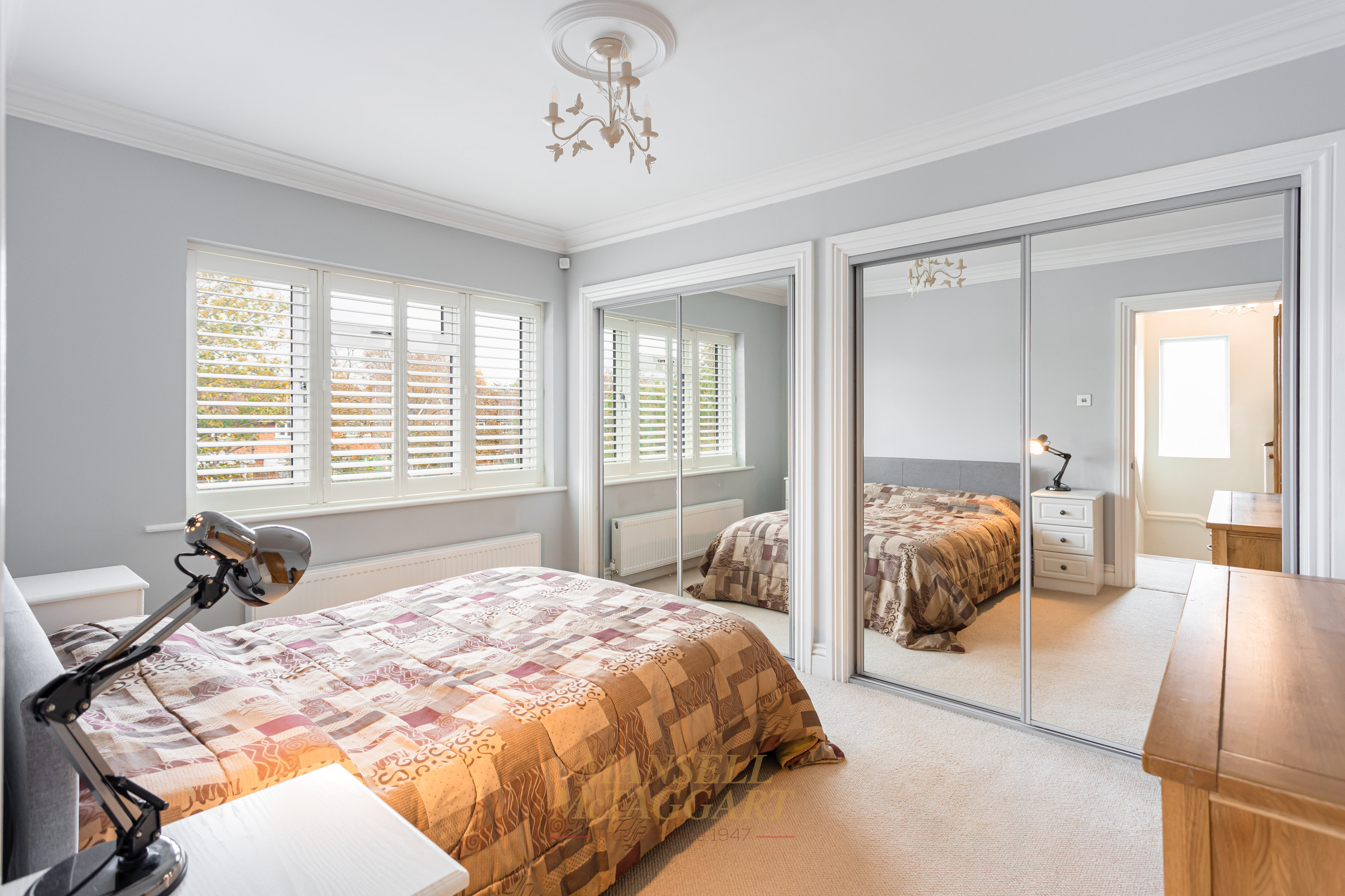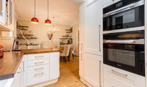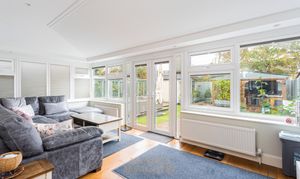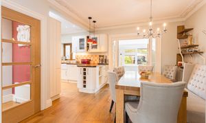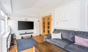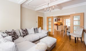 On approach to the home, you will notice the driveway parking for multiple vehicles, rebuilt and extended garage, and newly installed front door to the home. Inside you are greeted with a remodelled entrance hall with ample space for shoes and coats, doors to open plan living space, cloakroom and remodelled oak staircase. Starting in the open plan living space, is the living room. This is a well proportioned room with a large bay window to front, allowing in lots of natural light. Here there is space for multiple family sofas and freestanding furniture and a simply stunning integrated media wall as a focal point to the room. There is also engineered wood flooring underfoot which continues throughout the entirety of the downstairs accommodation and ceiling roses and decorative etched coving which runs throughout the whole home. The kitchen/dining space is also well sized, easily accommodating a 6+ person dining table and furniture, and a host of modern fitted kitchen units, breakfast bar and Miele integrated appliances. To rear is the extended reception room, currently used as a further living space but has a versatile use being flooded with light rom triple aspect windows and Velux windows.