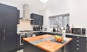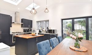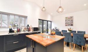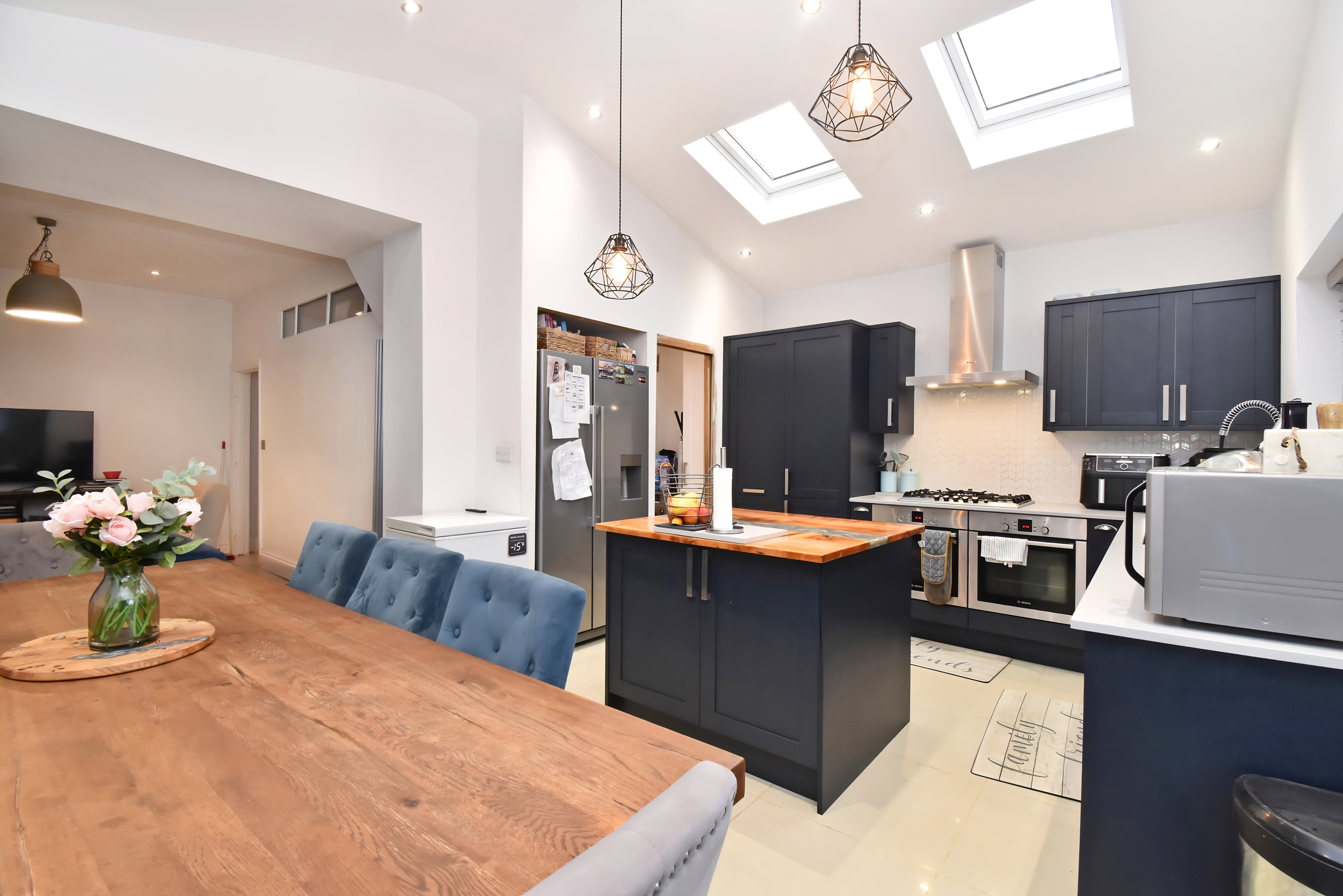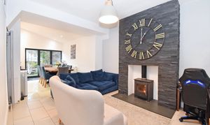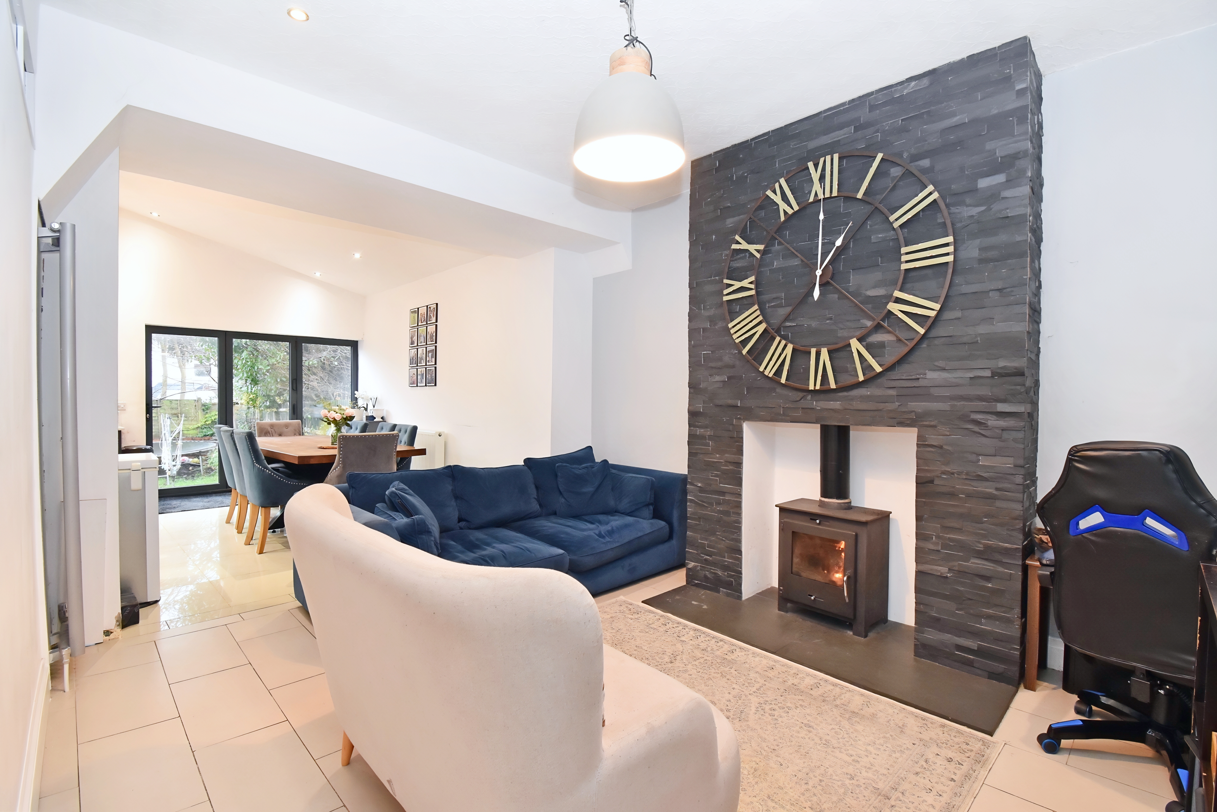 Upon entering, you are greeted by a bright and airy living room featuring a large bay window that floods the space with natural light. The heart of the home is the beautifully extended open-plan kitchen, dining, and living area, designed for modern family living and entertaining. This sociable space includes a movable kitchen island for flexibility, ample wall and base cupboards, generous worktop space, a charming log fire offering a cosy and inviting atmosphere, and bi-fold doors that seamlessly connect the interior to the garden. A dedicated utility area and downstairs WC add further practicality. The versatile extra downstairs room, where the original kitchen was located, is currently used as a fourth bedroom but could easily serve as an office or playroom, depending on your needs.