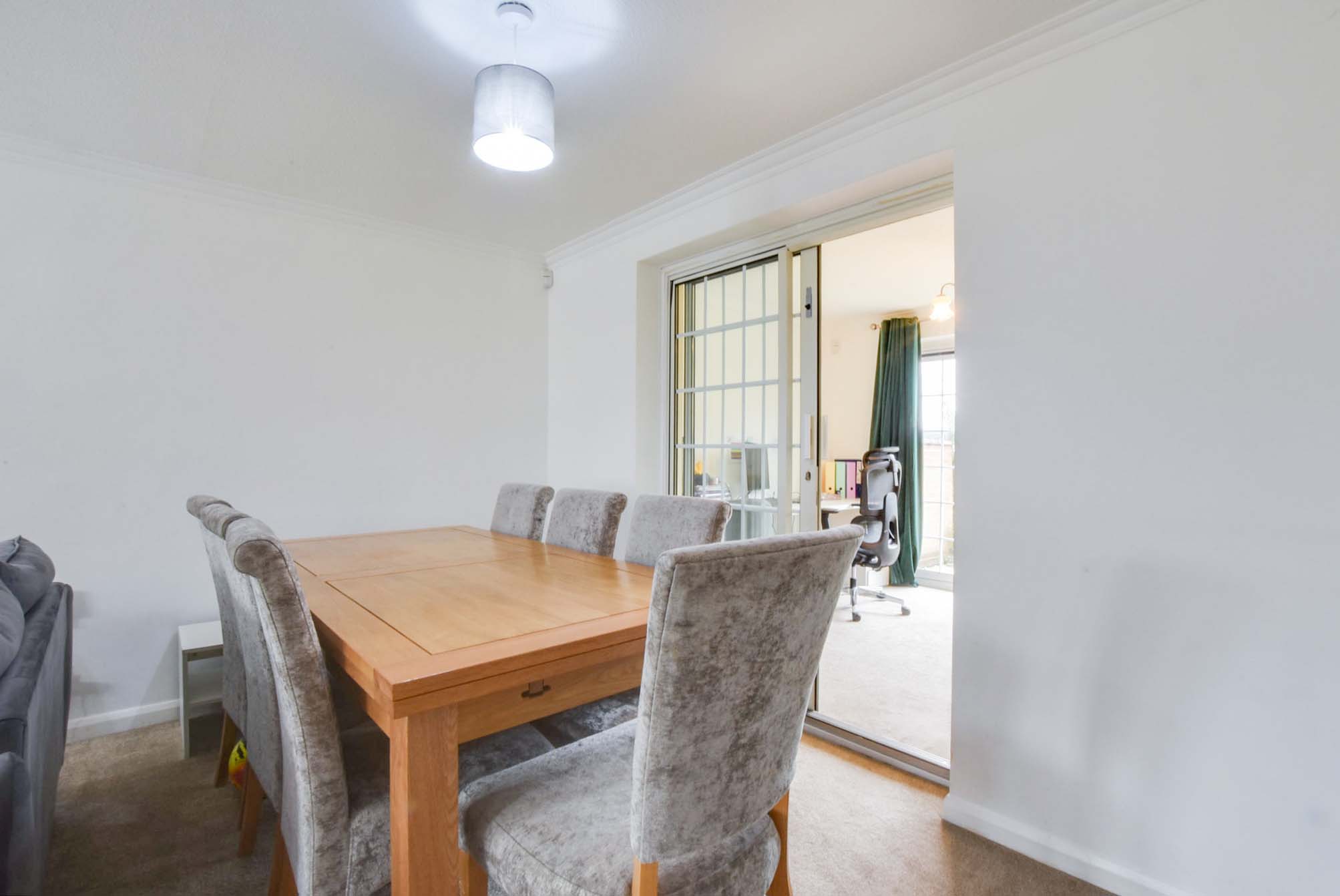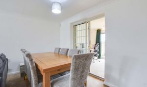 The property is entered via a porch leading into the entrance hall, with stairs rising to the first floor and access to the ground floor rooms. To the front, the living room features a bay window and gas fire, creating a generous main reception space. Sliding doors lead through to the dining room, providing flexibility for either separate or connected living. The dining room benefits from patio doors opening out to the rear garden.