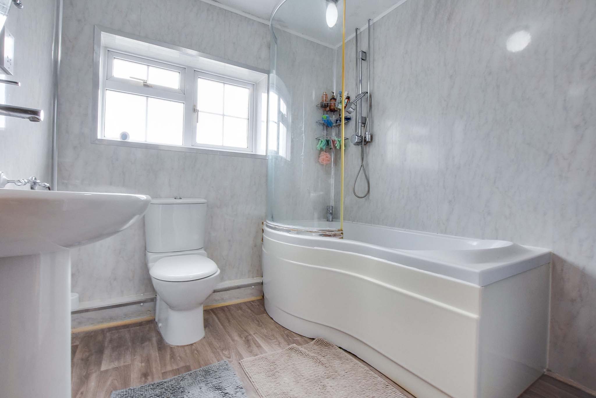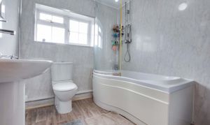 Double-glazed window to the rear elevation, vinyl floor, tiled walls, bath, hand-wash basin, WC, and a towel radiator.