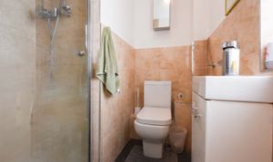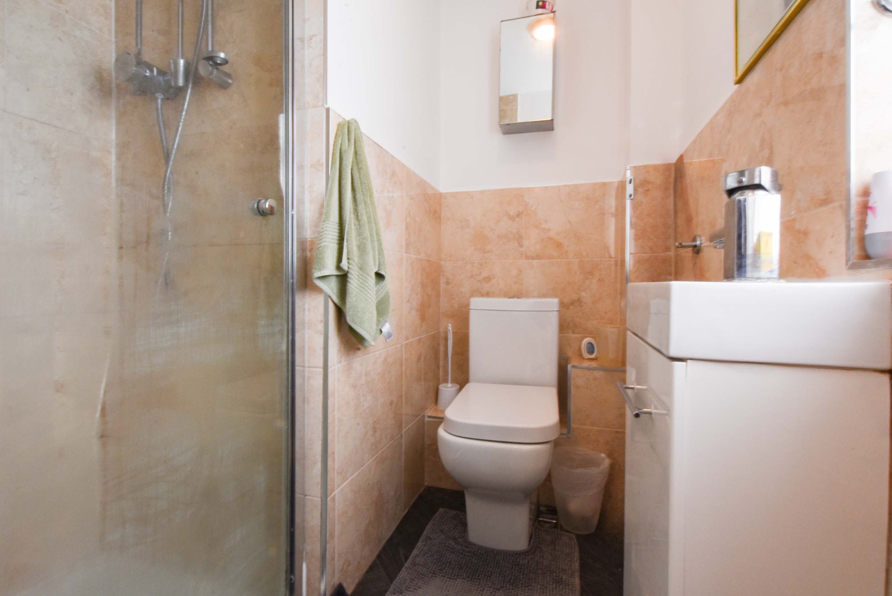 Double-glazed window to the front elevation, vinyl floor, part-tiled walls, shower, WC, hand-wash basin, and a radiator.