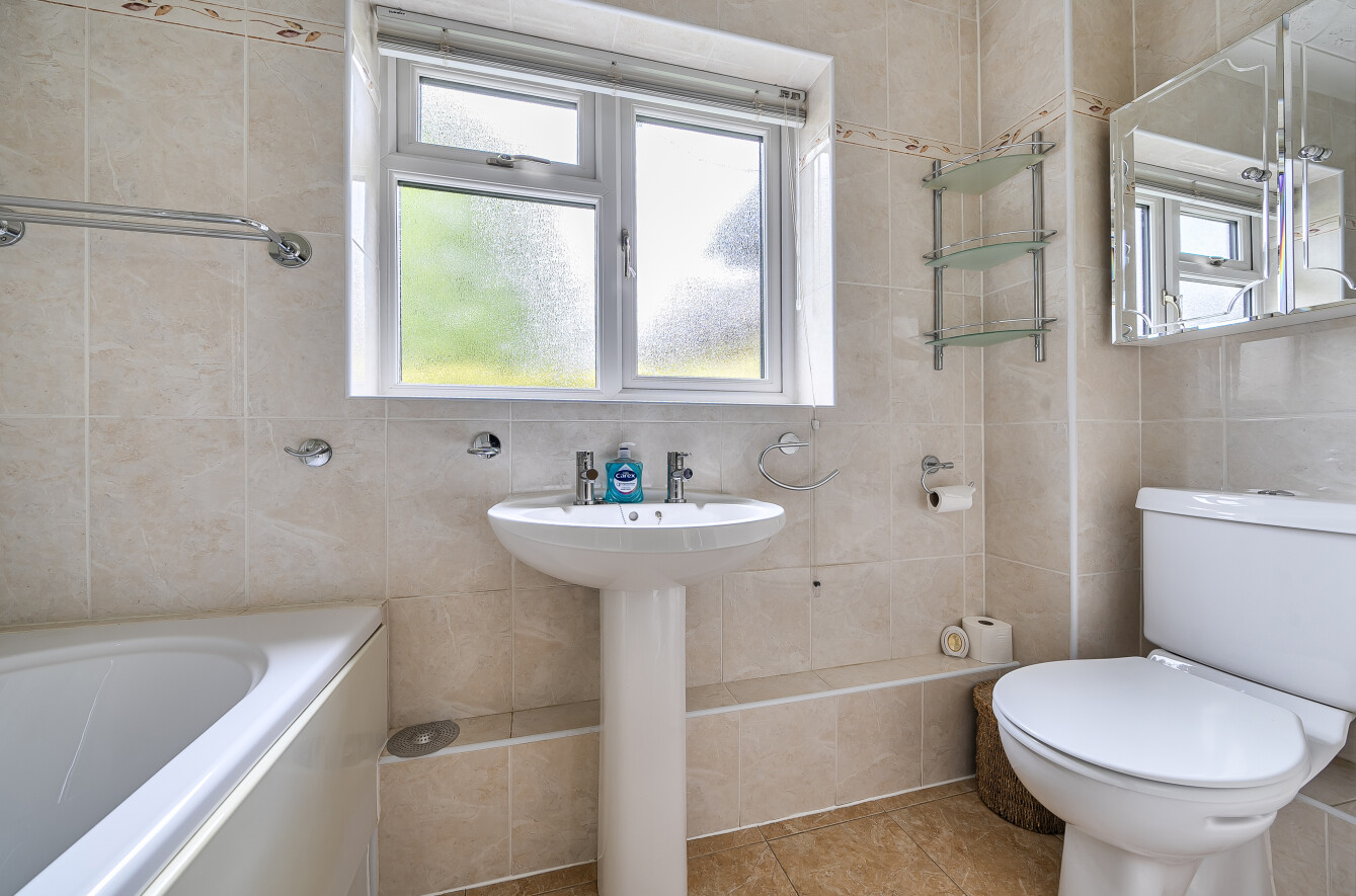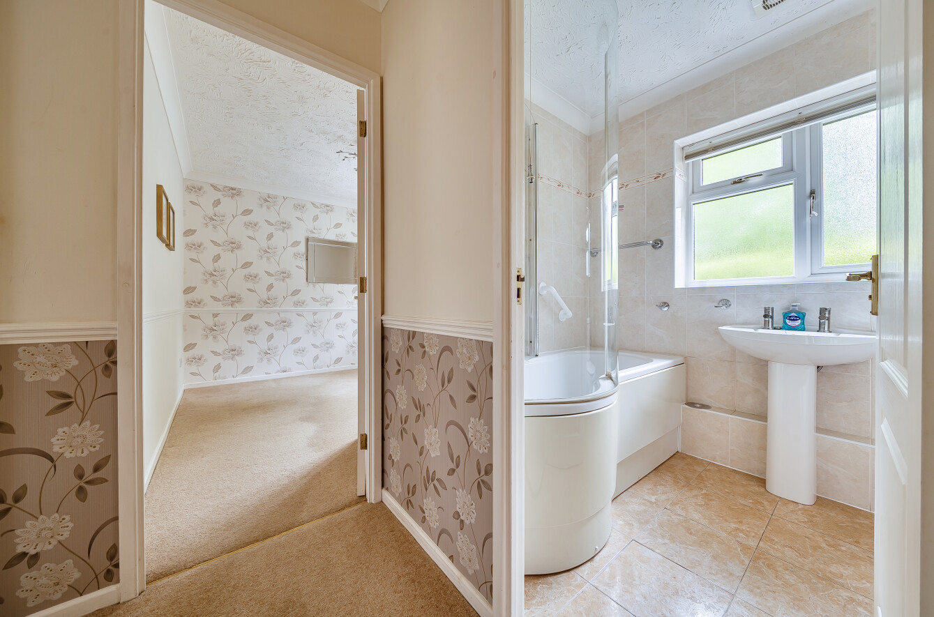 The bathroom has been updated with a modern suite and shower over the bath, and there’s also a separate cloakroom off the main hallway, which is always useful in a bungalow layout.