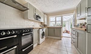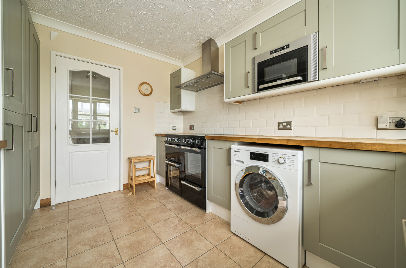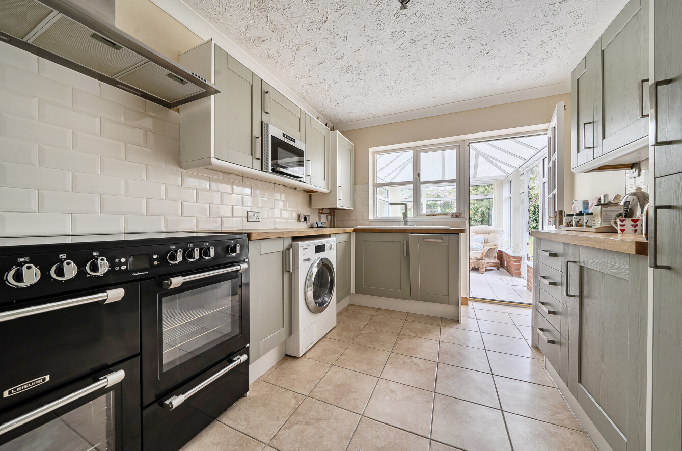 Inside, everything flows off a central hallway, which gives the layout a really practical feel. To one side, the kitchen has been finished in a taupe shaker style with chrome fittings and integrated appliances, and this opens through into a conservatory that looks straight out onto the garden and patio. It’s a nice, natural extension of the space and works particularly well for day-to-day living.