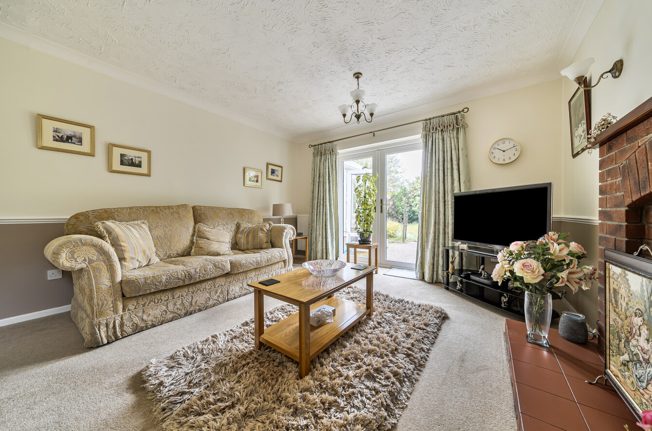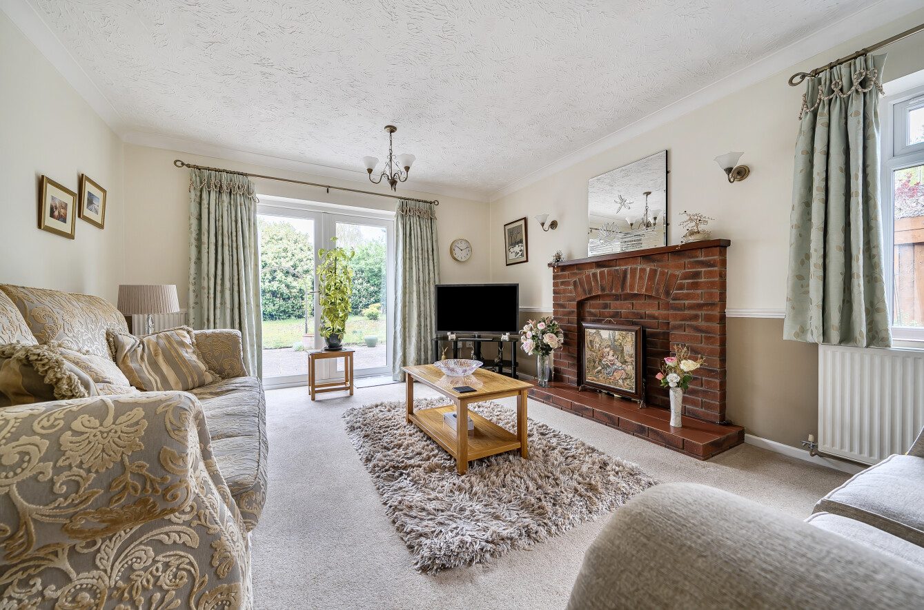 Back through the hallway, the main lounge sits centrally within the home, with a brick fireplace and living flame effect fire giving it a more traditional focal point. It’s a comfortable, well-proportioned room that feels separate without being cut off.