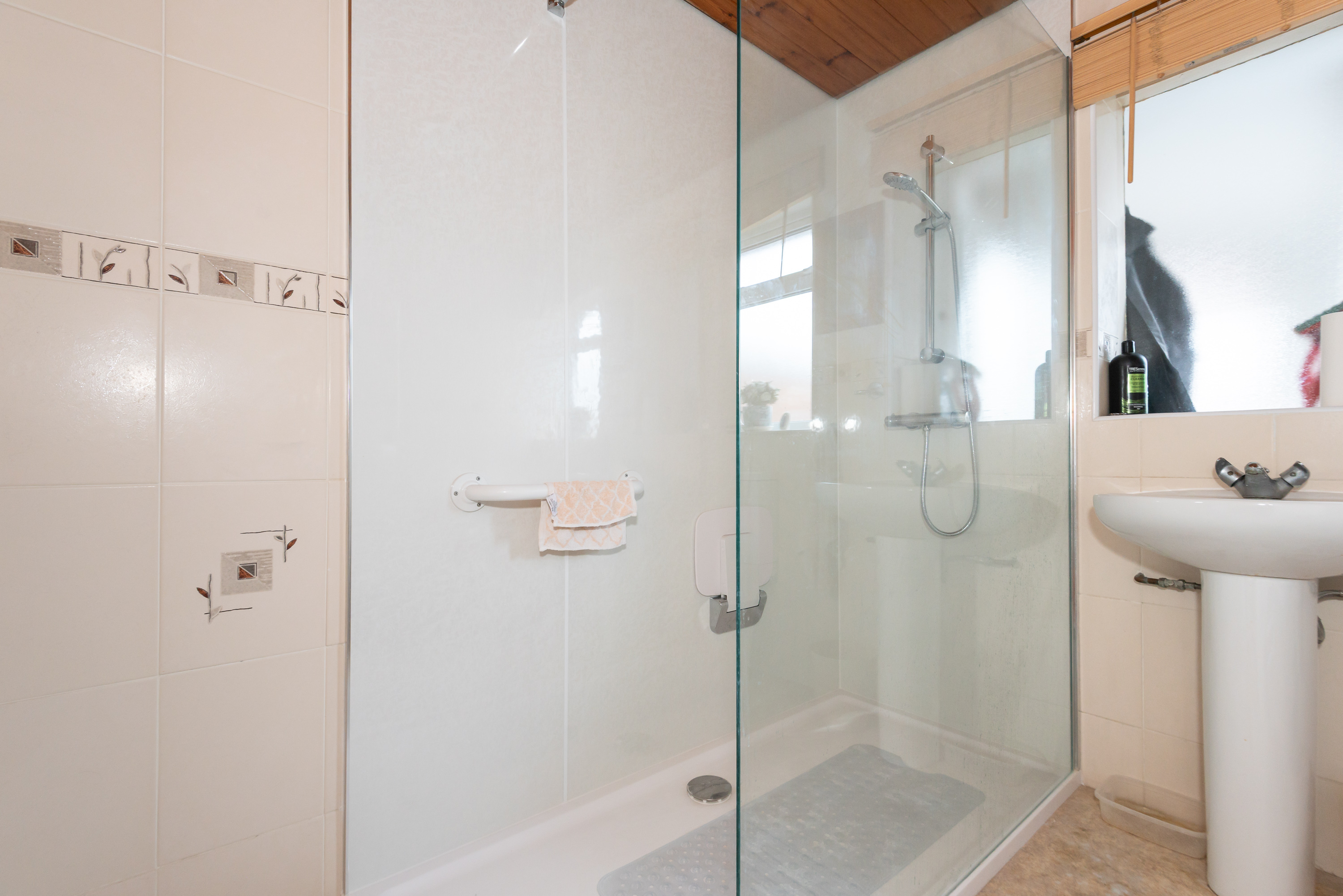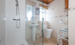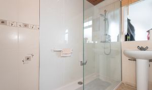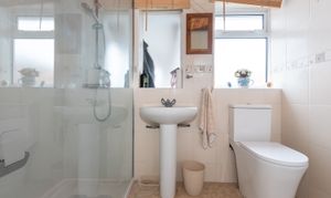 The sleek, modern bathroom features elegant fixtures and fittings, with a newly installed walk in shower, providing a touch of convenience.