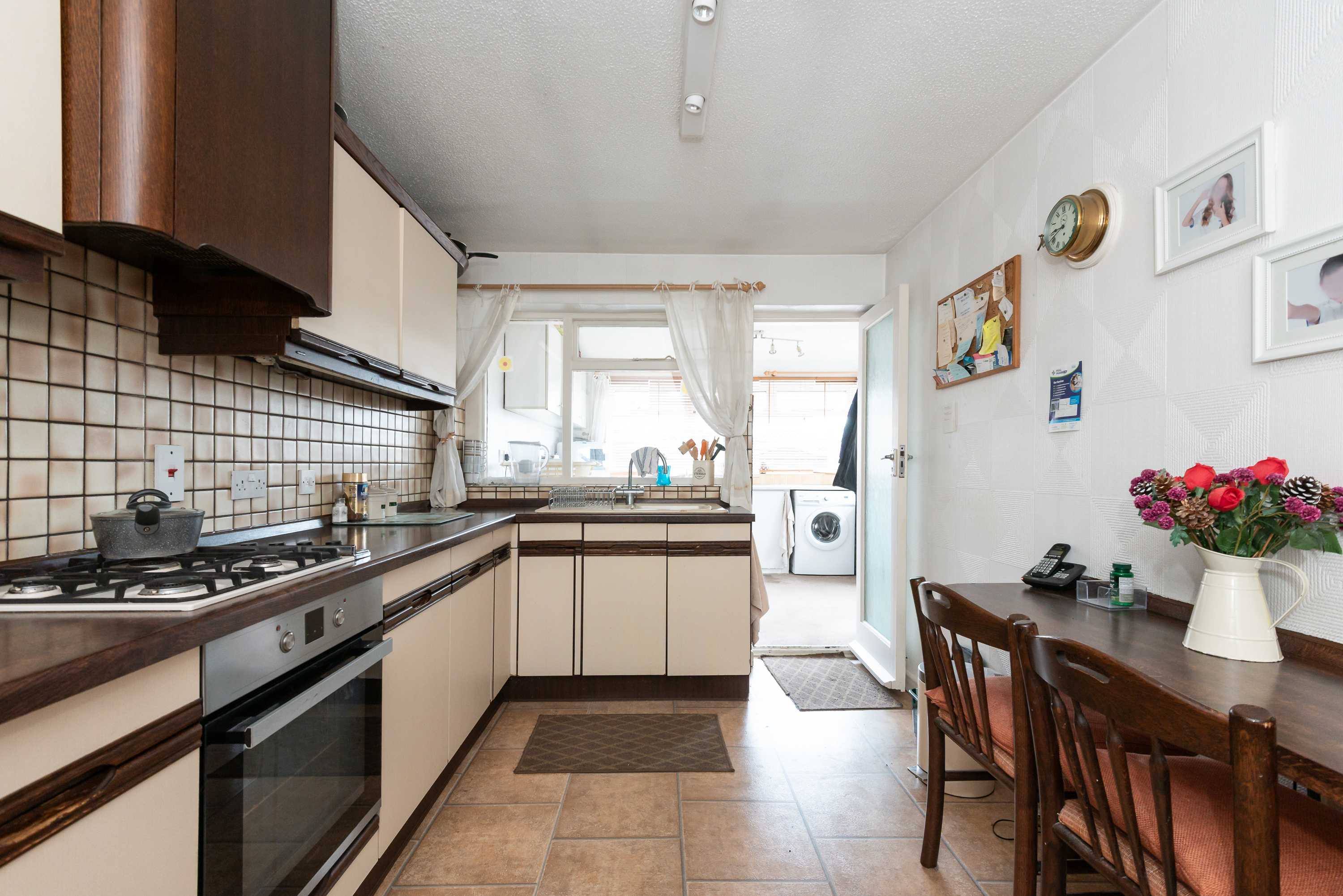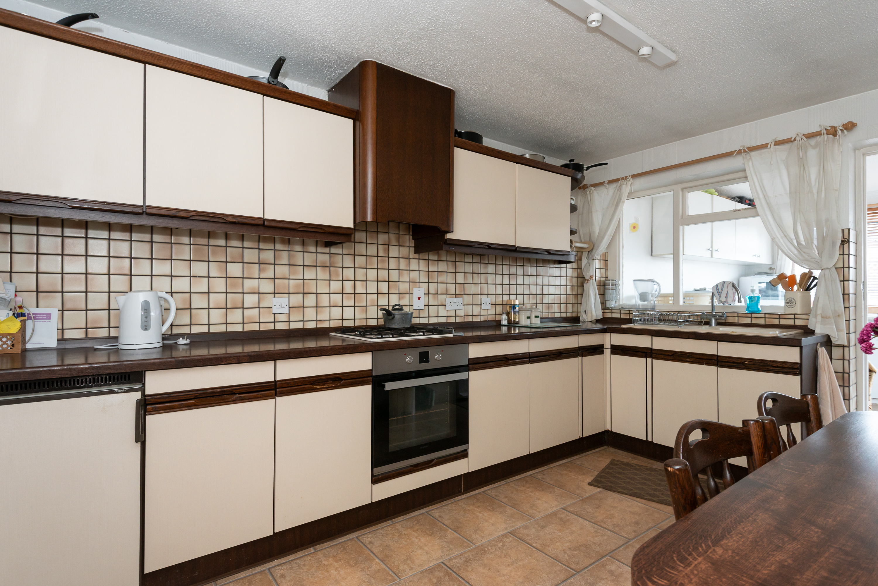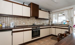 With tiled floor, kitchen units, integrated oven, gas hob and extractor, 1.5 bowl sink and tap, fitted breakfast bar, door to utility room, window, and radiator.