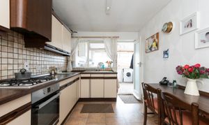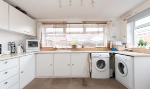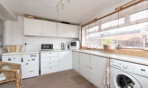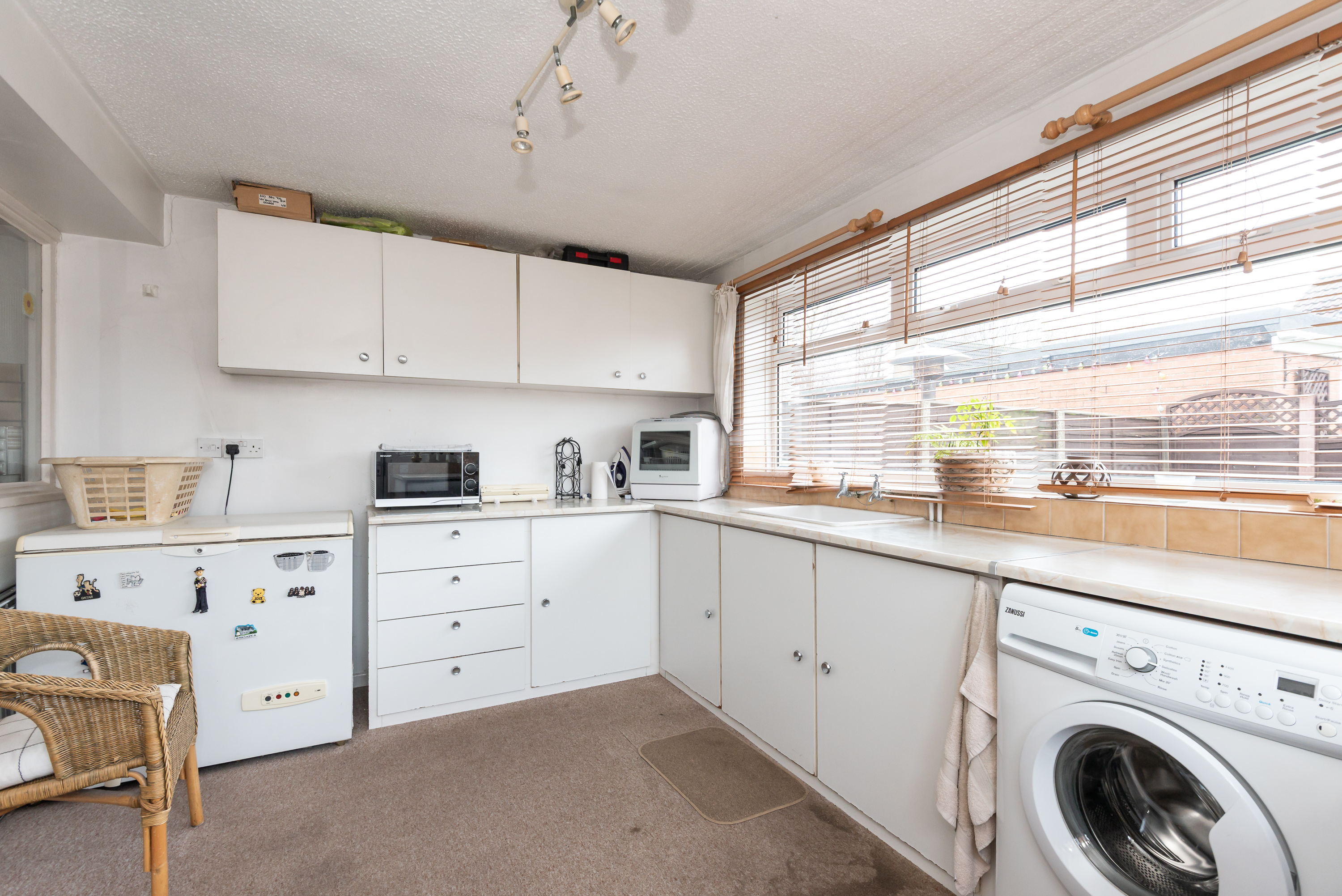 With carpet, kitchen units, laminate worktop, sink and tap, plumbing for washing machine, windows, radiator, and door to the rear garden.