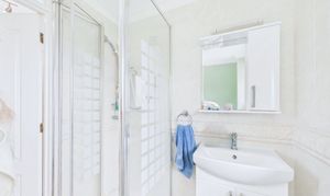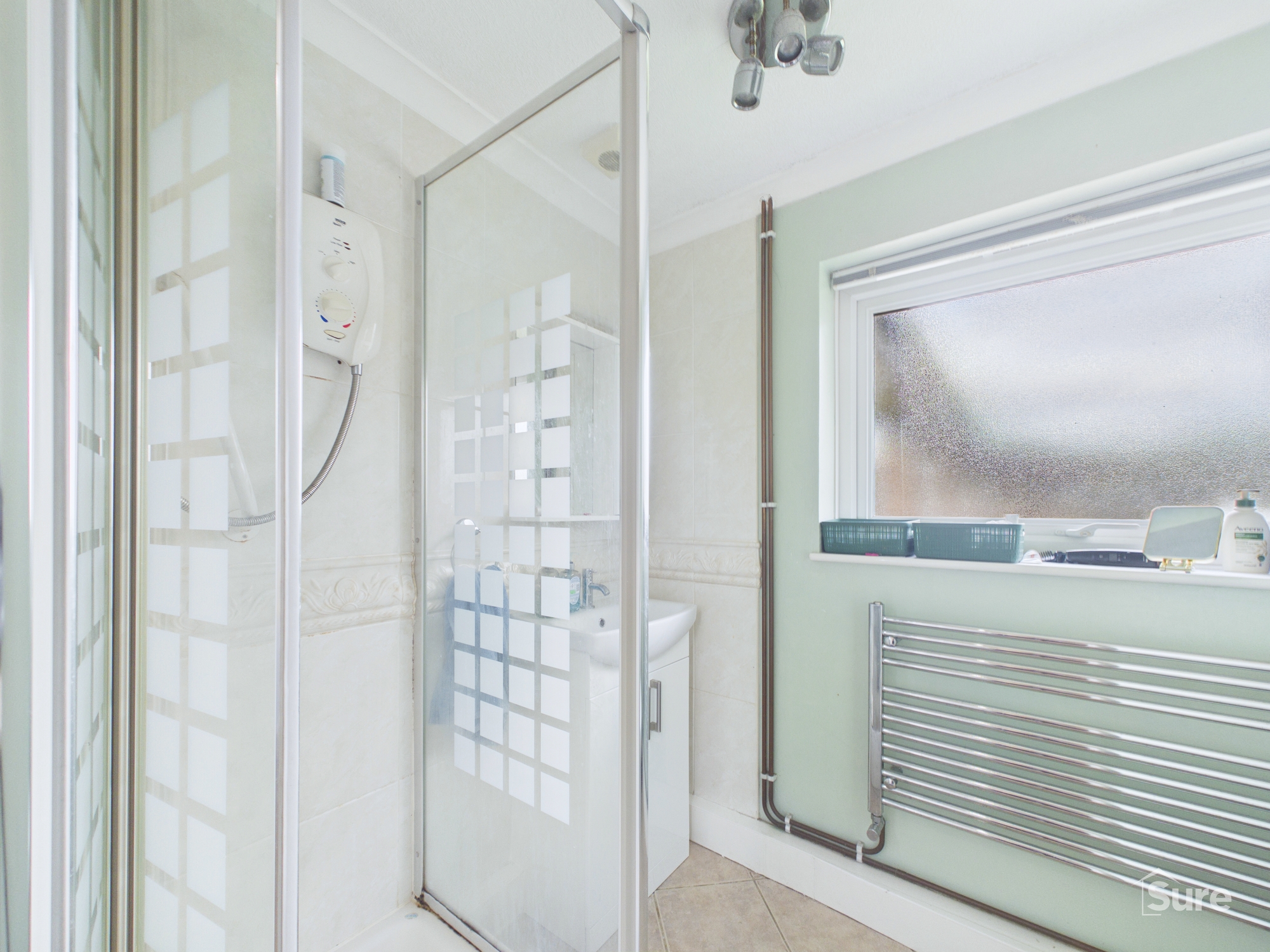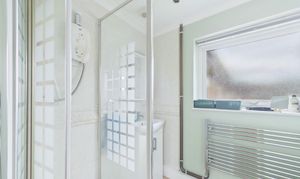 The bedroom is a good-sized double, providing plenty of space for furnishings, while the bathroom is fitted with a shower cubicle, wash hand basin, and low-level WC.