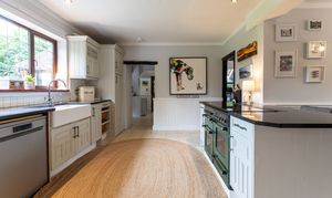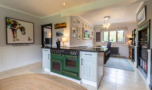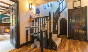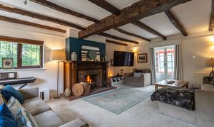 You are welcomed into the reception hallway leading through into the stylish triple-aspect living room with beautiful open fireplace, exposed beams, and French doors through into a light filled conservatory looking out onto the garden.