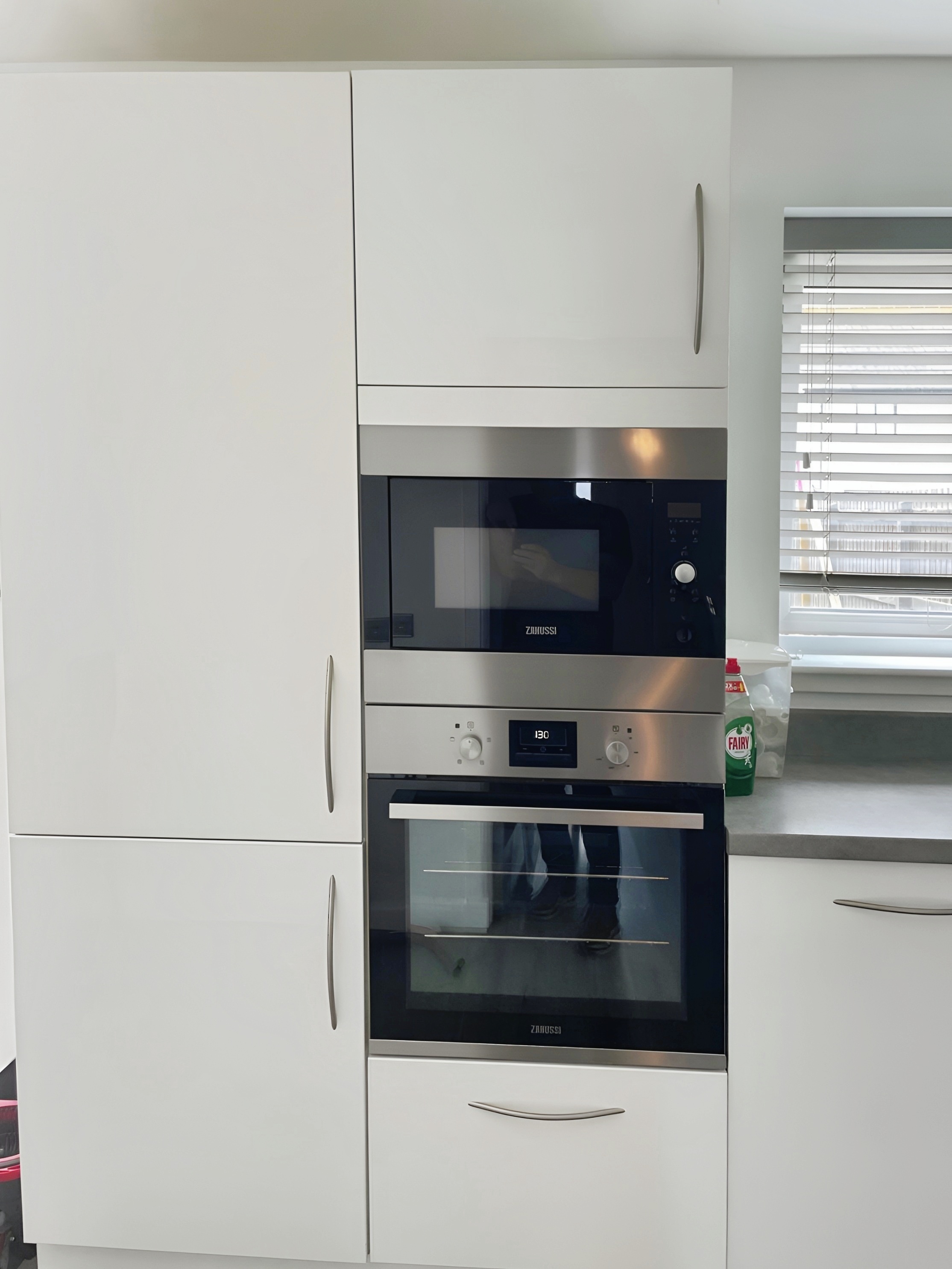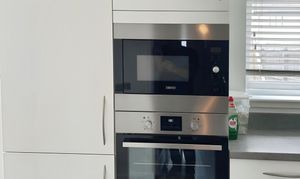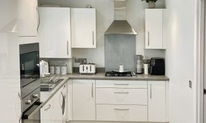 - Contemporary fitted kitchen with integrated appliances and dining space