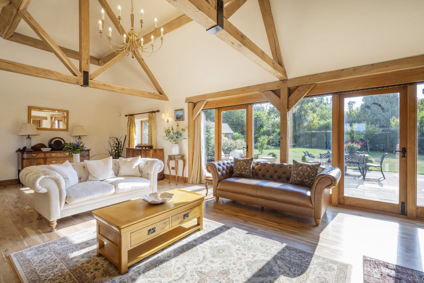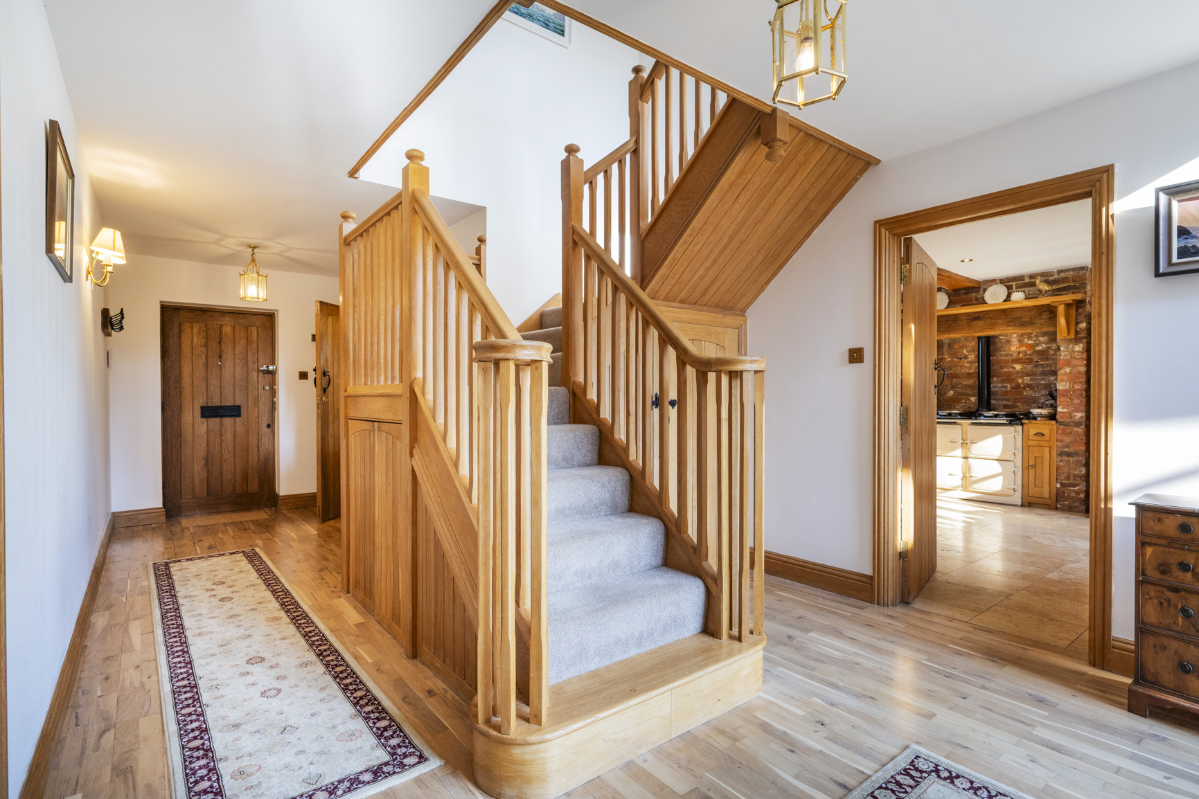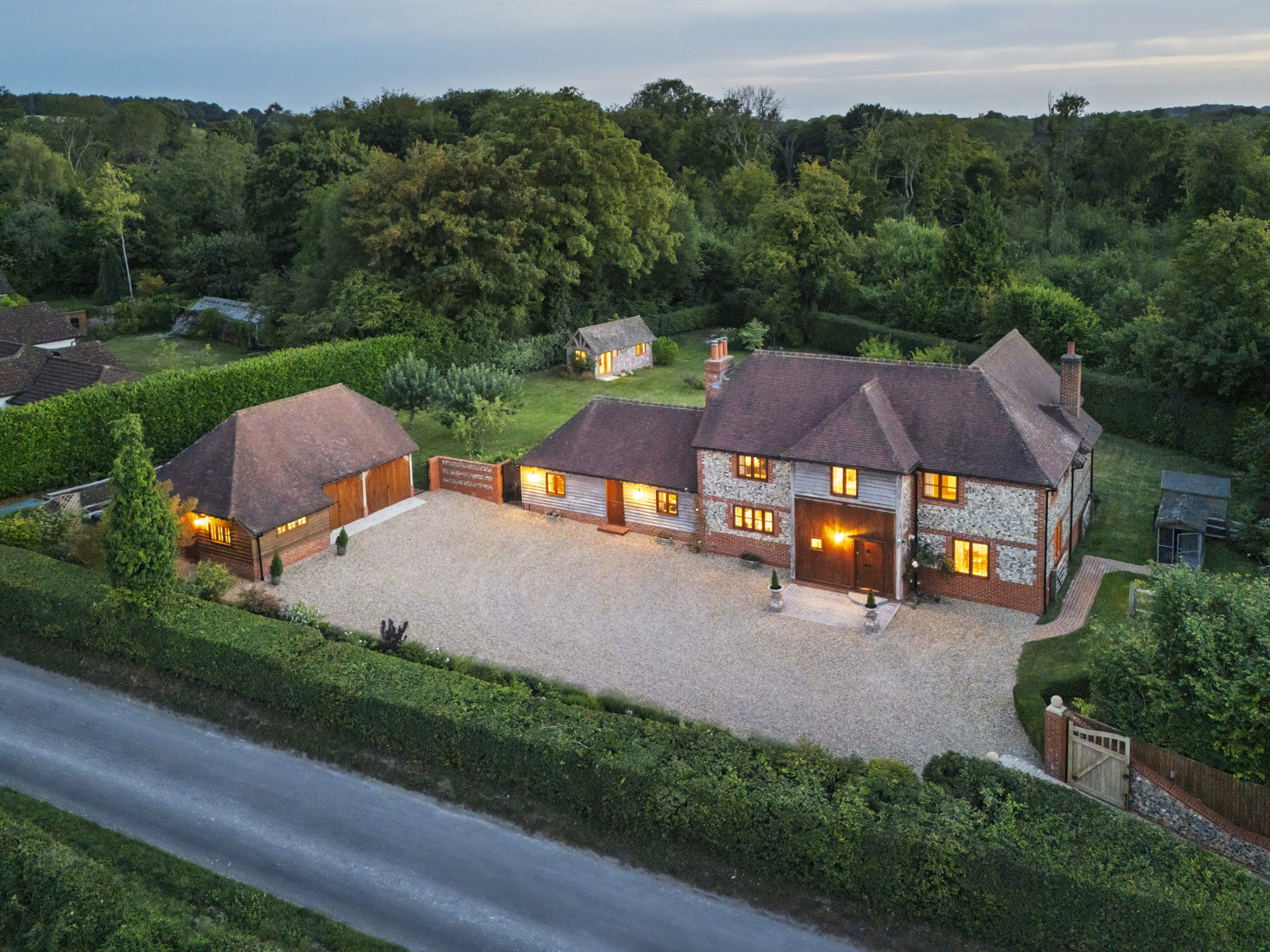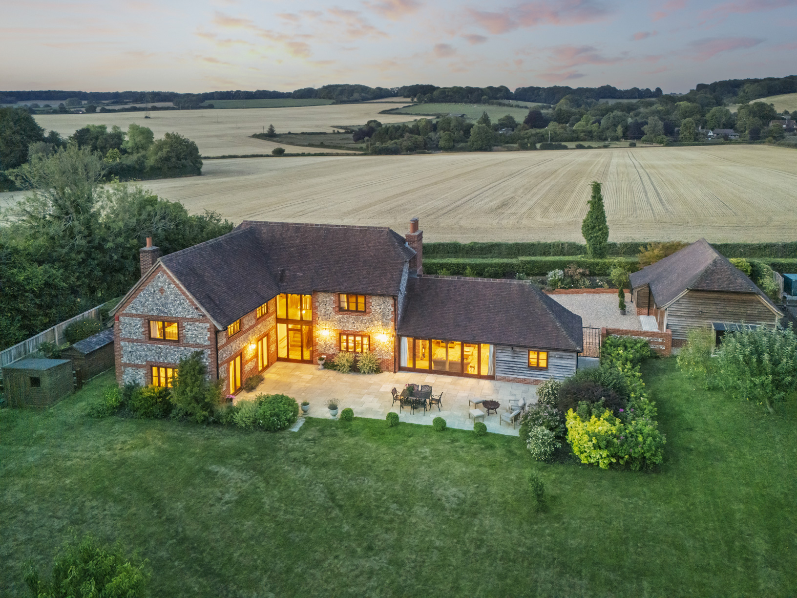 Willow Barn was built in 2001 by the current owners to a high specification combining traditional craftsmanship with modern elegance. The exterior showcases a timeless blend of flint and Selborne brick, complemented by oak cladding that adds warmth and character.