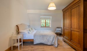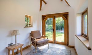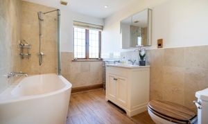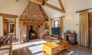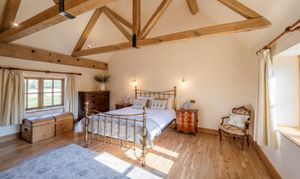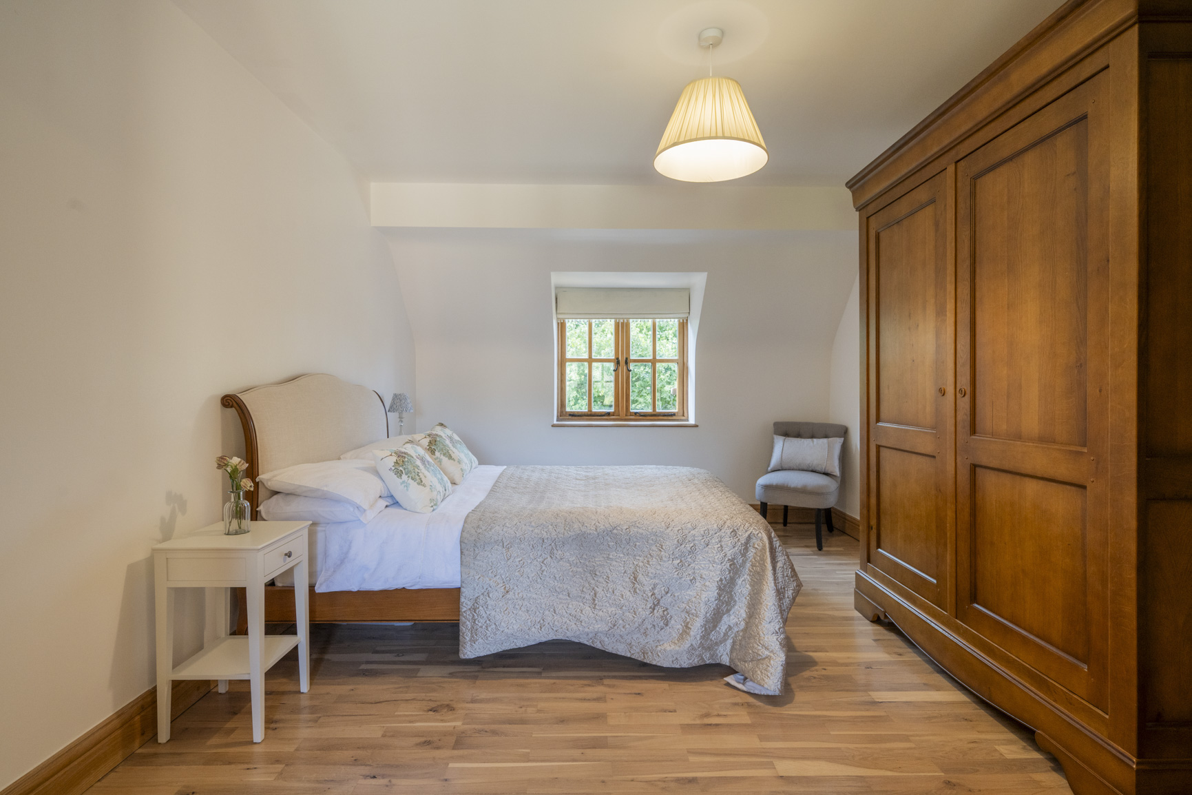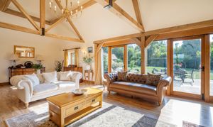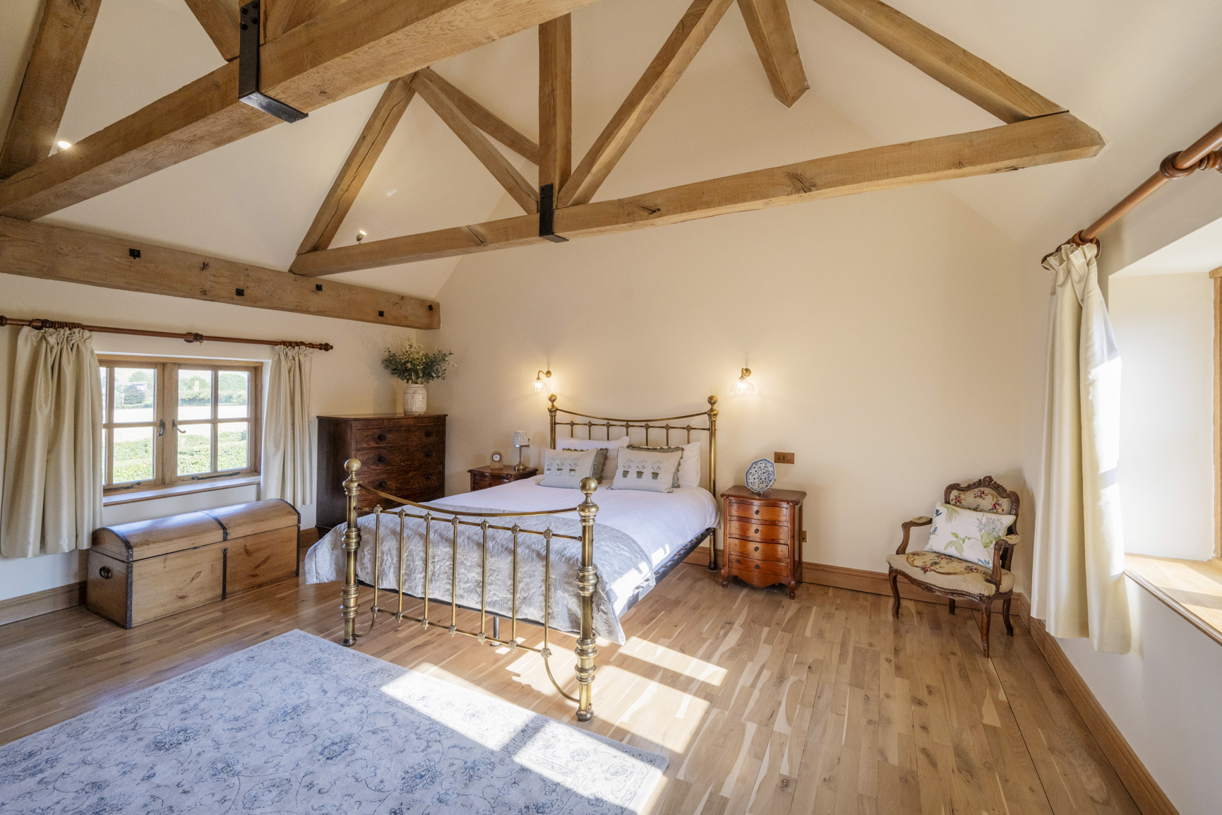Upstairs a spacious master bedroom, featuring another beautifully crafted oak-beamed vaulted ceiling, solid oak flooring, and an elegant ensuite shower room, provides breath taking views of both the front and rear gardens.