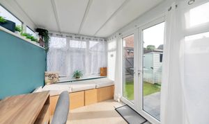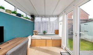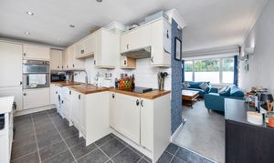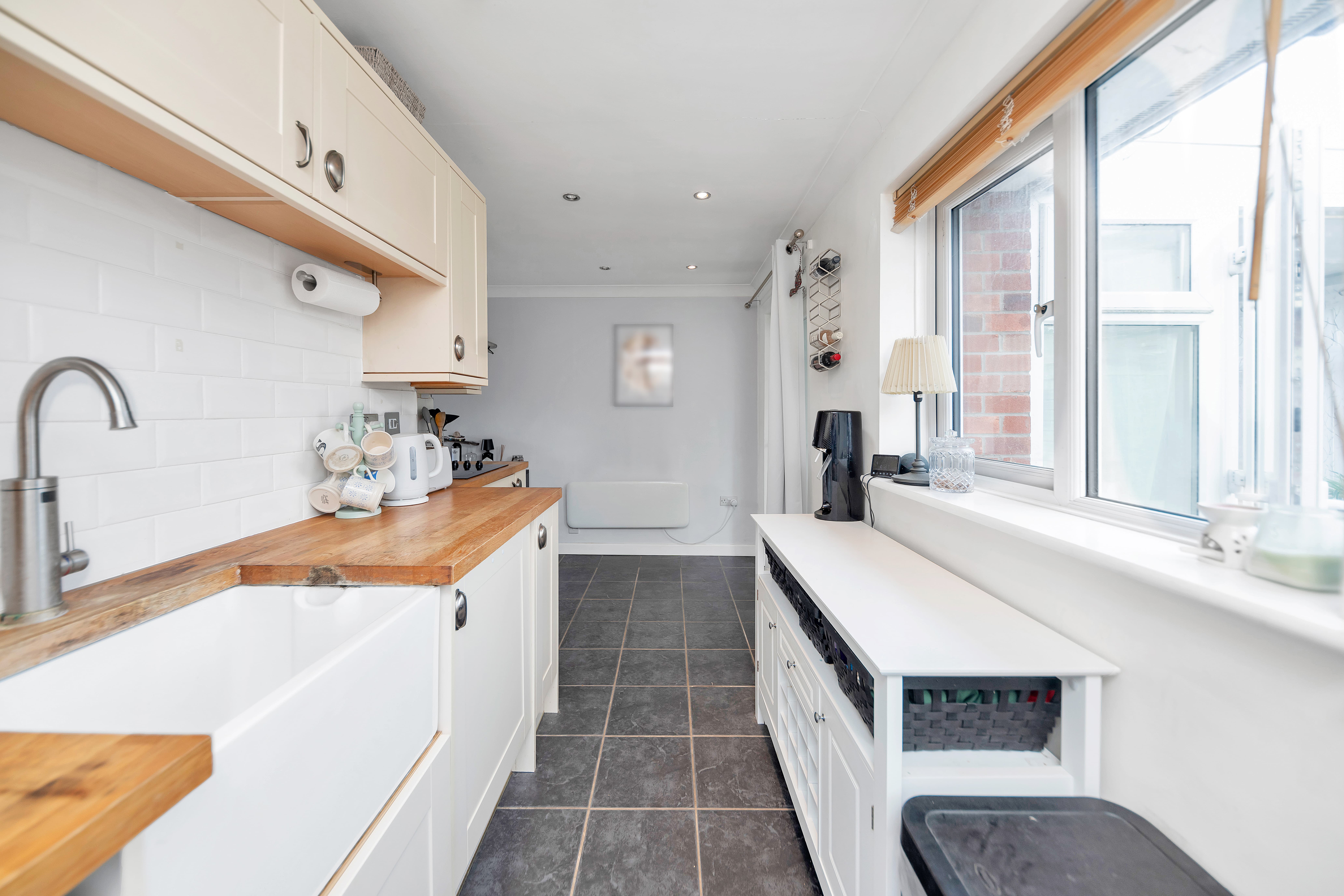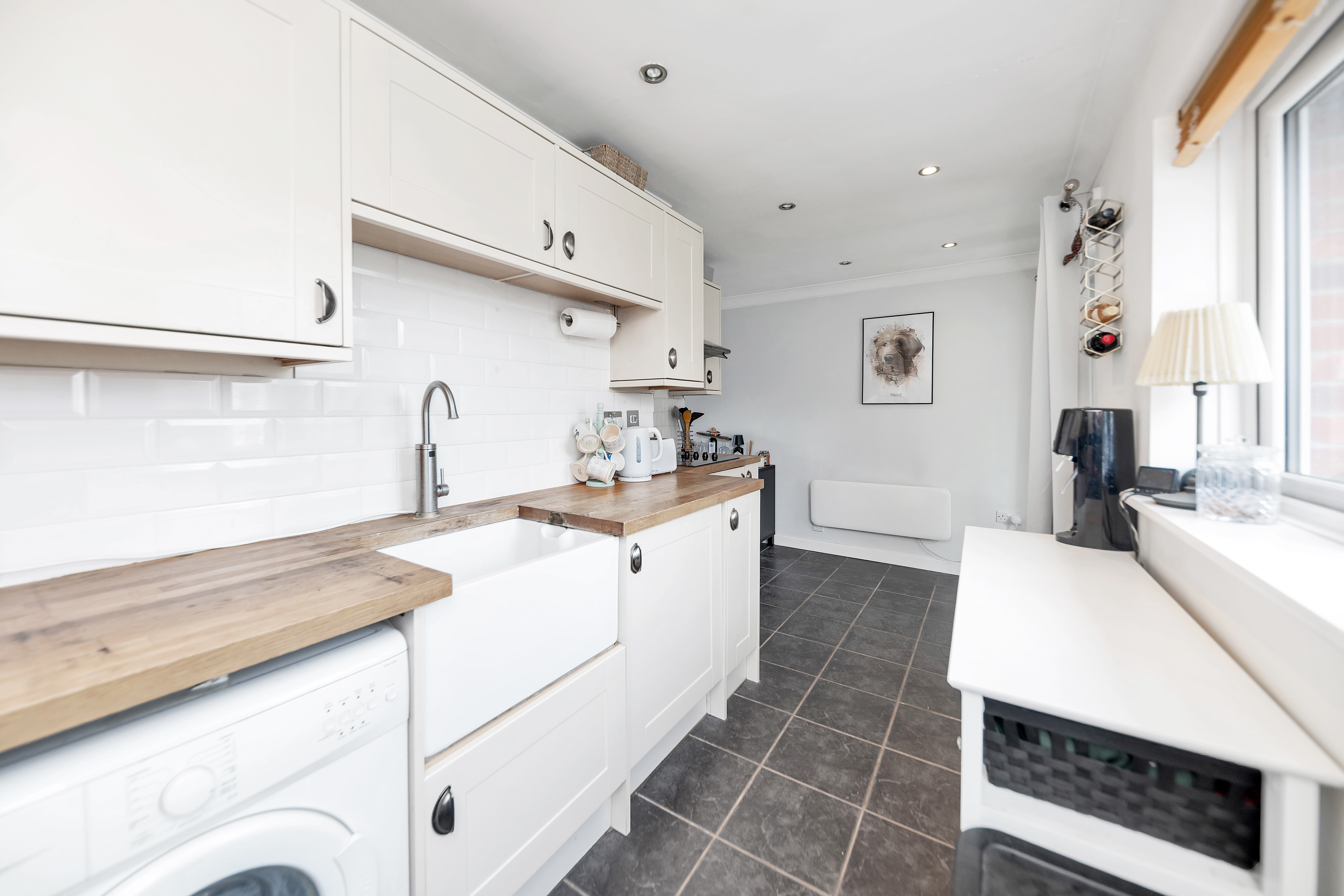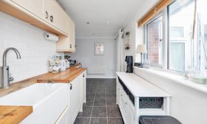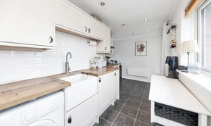The kitchen is a very good size, enjoying a range of base and wall units, wood worktops, a butler sink, tiled flooring and splashbacks, inset lighting, an integrated oven, hob, extractor fan and fridge/freezer, and space for a washing machine and other small kitchen appliances. The conservatory provides further versatile reception space, benefiting from a lovely garden aspect, carpets and space for furniture.