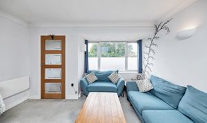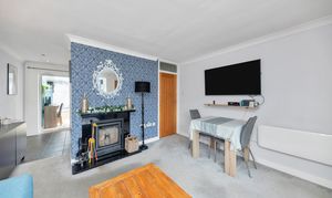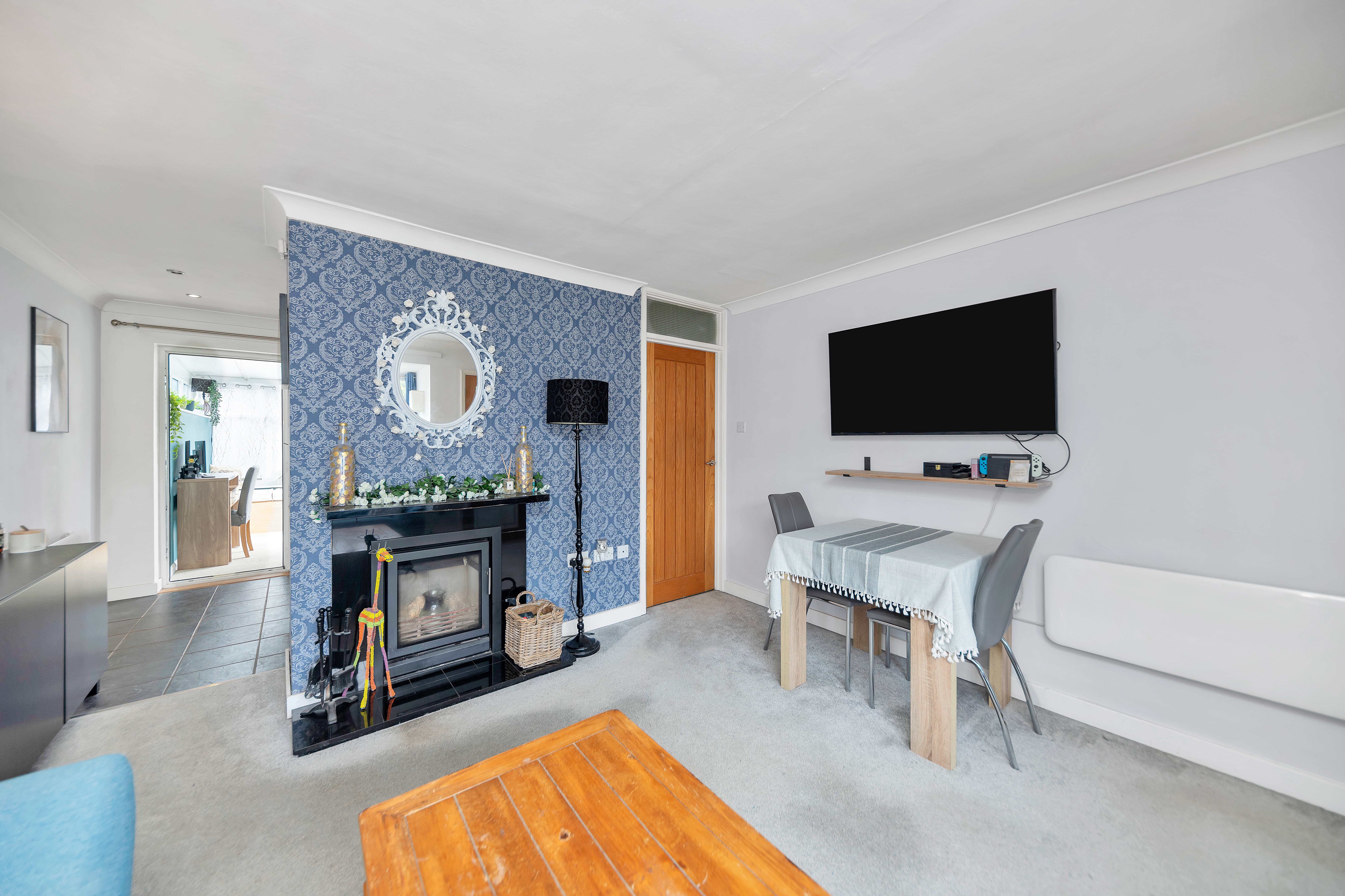 This spacious mid-terrace home enjoys a pleasant and tidy frontage, surrounded by a low fence, with gravel front gardens, beds of shrubs and space for potted plants. Upon stepping inside, the entrance hallway provides space for coats and shoes before opening up into a nicely presented lounge/dining room. It benefits from a window to a front aspect, carpets, sconce lighting, a fireplace with a wood-burning stove, and ample space for lounge, dining and storage furniture.