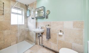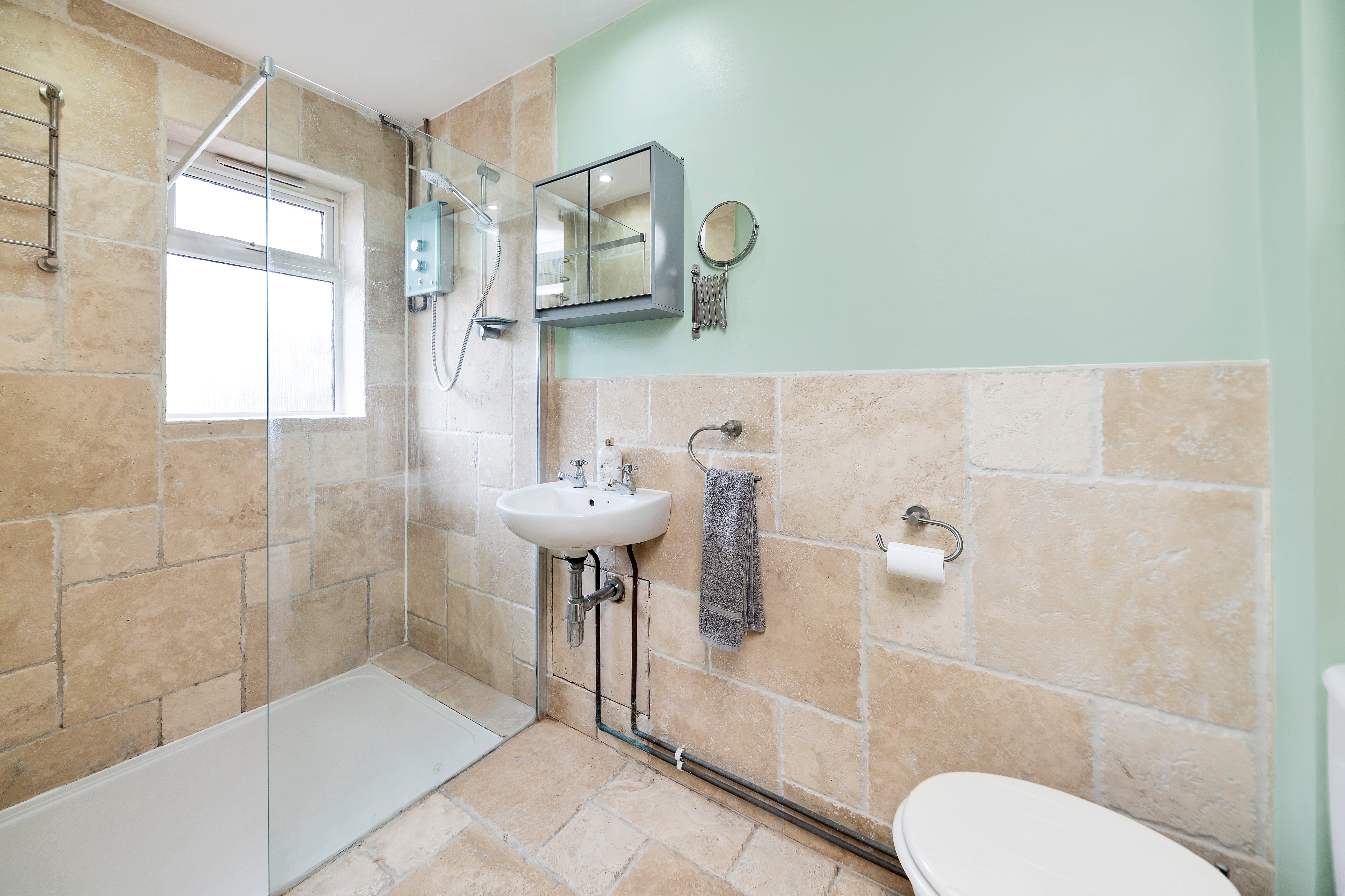Through to the sleeping quarters, this lovely home continues to offer generous accommodation, with 1 double bedroom and a bathroom comprising a shower, a WC, a hand wash basin, and integrated storage.