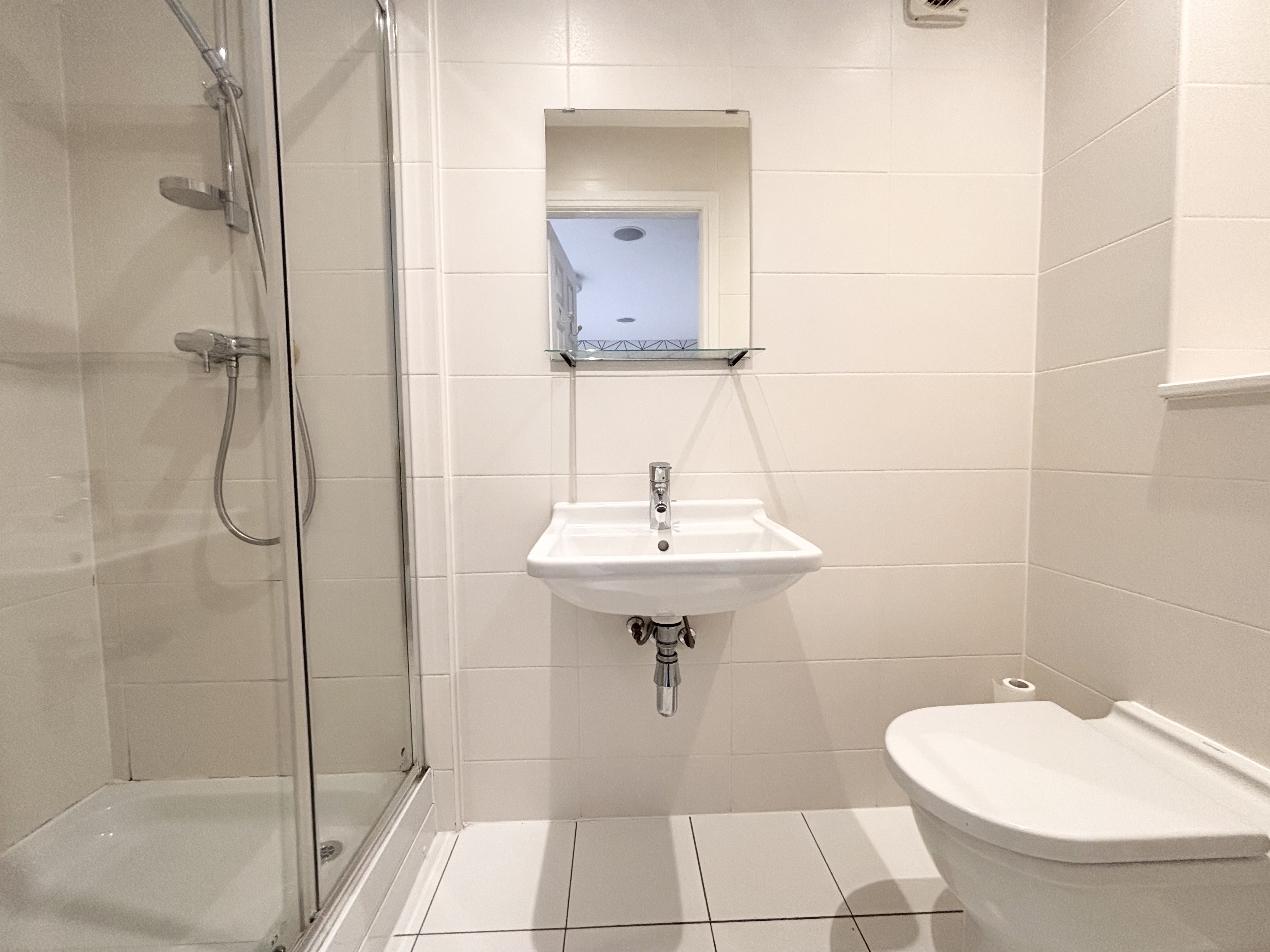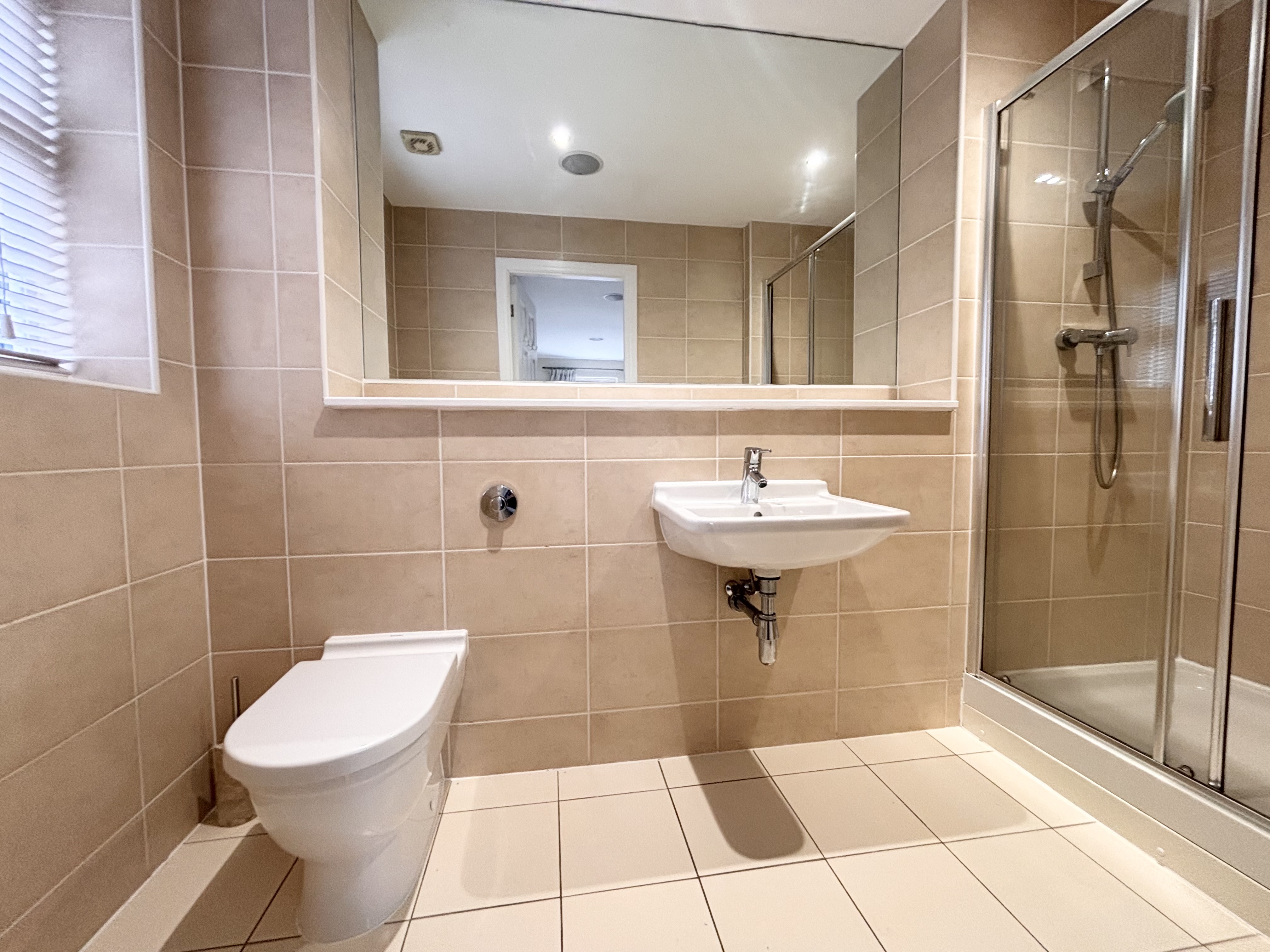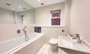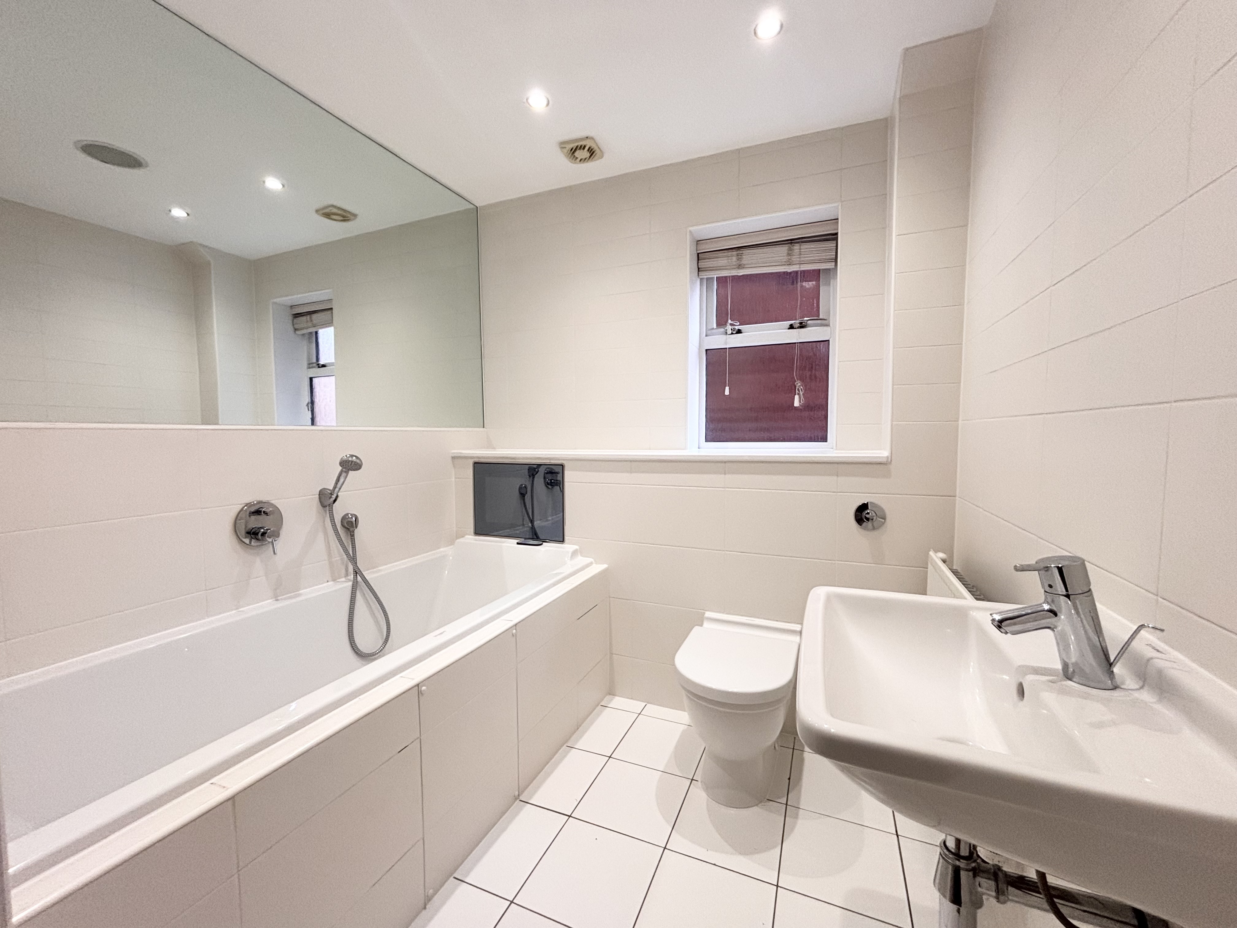 Window to the side elevation. Fitted with a moder white suite complete with a bath, low level W.C and a wall mounted hand wash basin. Tiled walls and floor. Inset spotlights.
