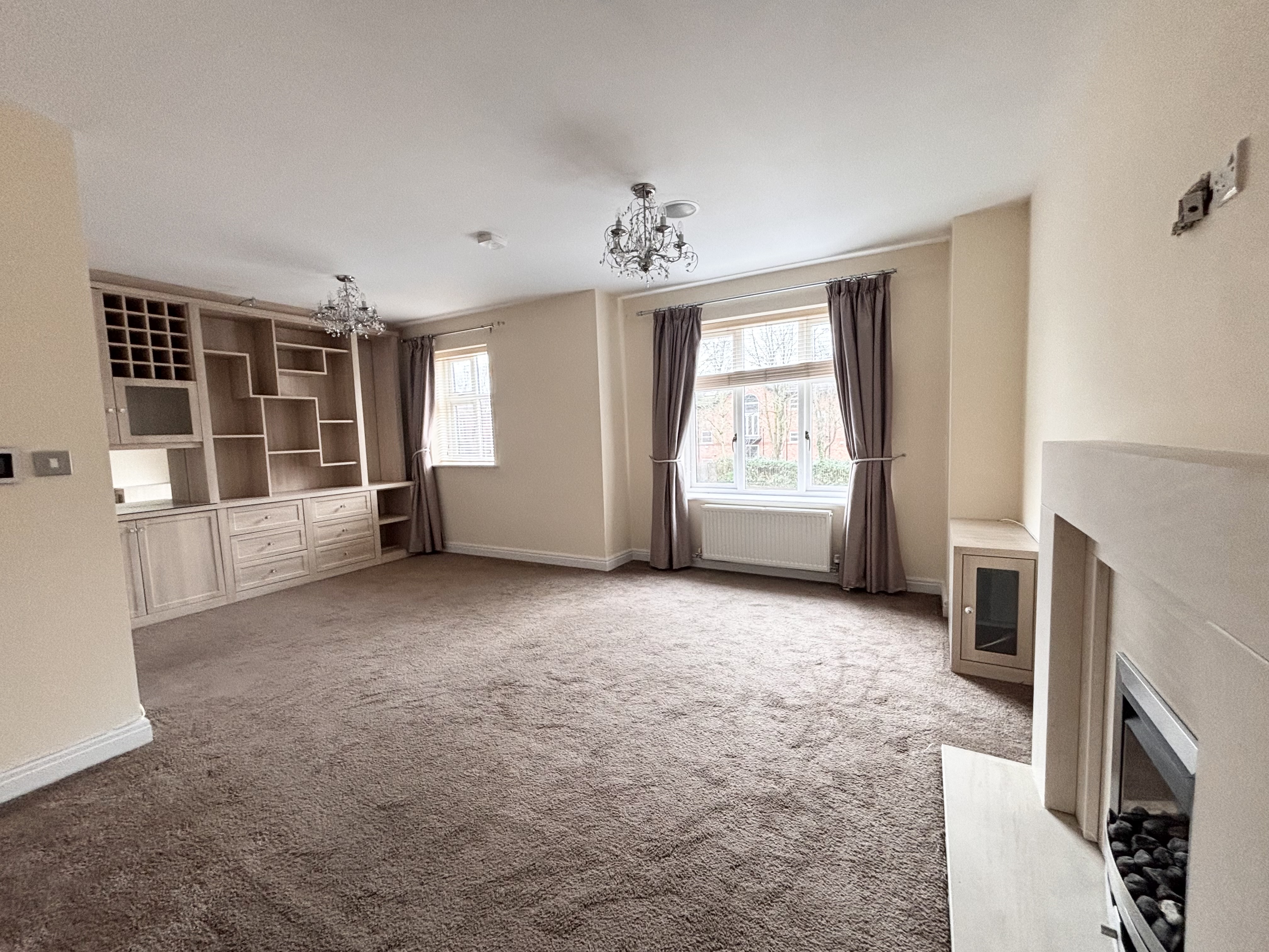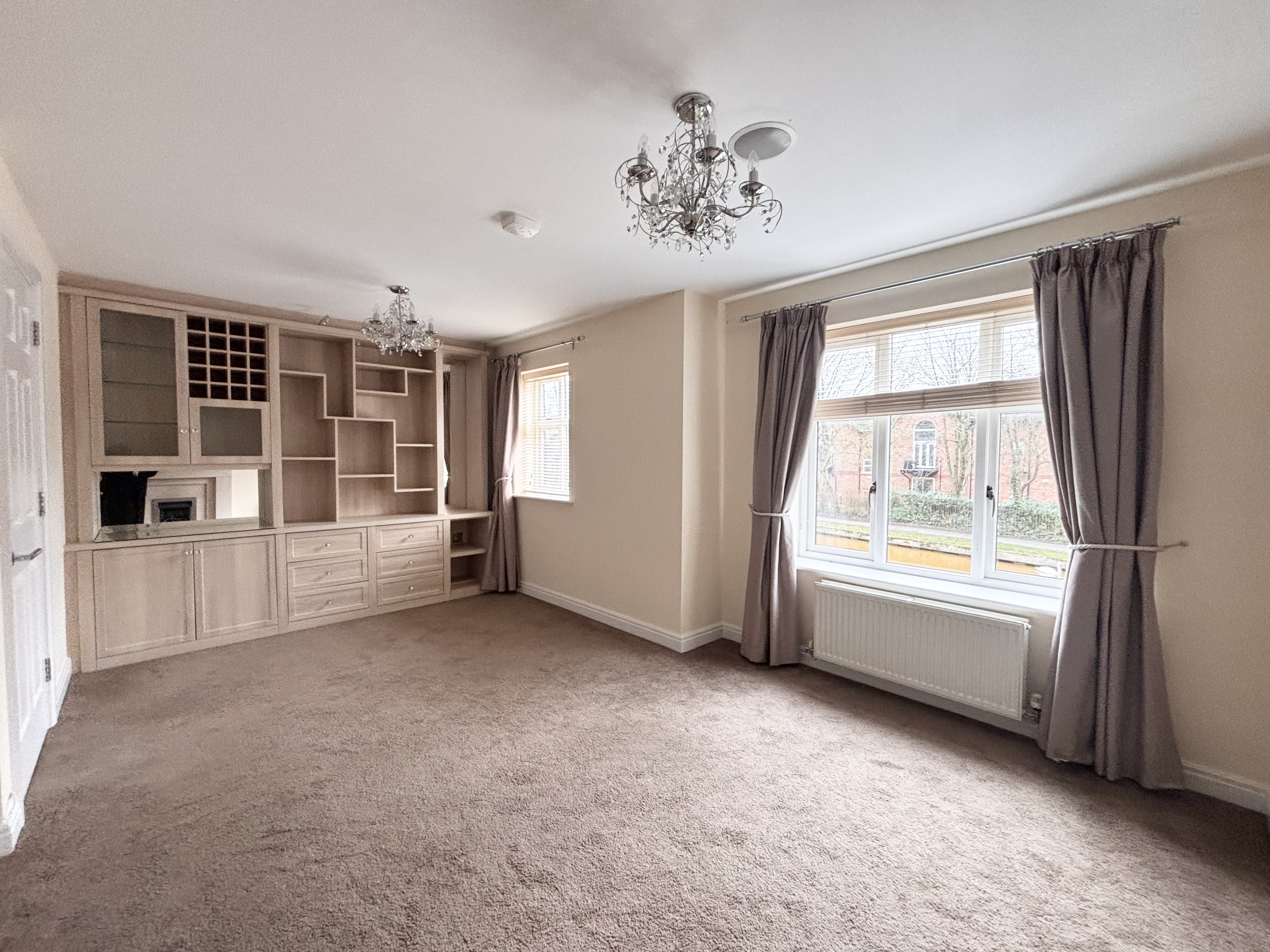 Two windows to the front elevation with open views over the Bridge Water Canal. Custom fitted wall to wall display unit in. Feature stone fire surround complete with gas living flame fire. T.V point.