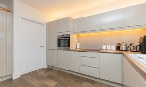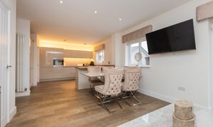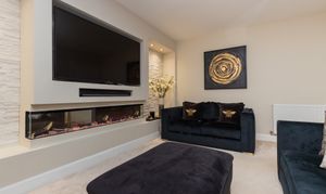 The principal lounge is generous in proportion and elegant with nay window and a stunning media wall fireplace, which perfectly blends sleek design with advanced technology, making it an essential statement piece for any contemporary living area. Particular mention to the designer kitchen complete with a family and dining area. Dual French doors flood the space with natural light and provide direct access to a composite deck terrace within the south-facing garden, making this the true heart of the home and ideal for family or guest entertaining.
