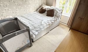 Access to three bedrooms and a shower room. Cupboard, carpet flooring.