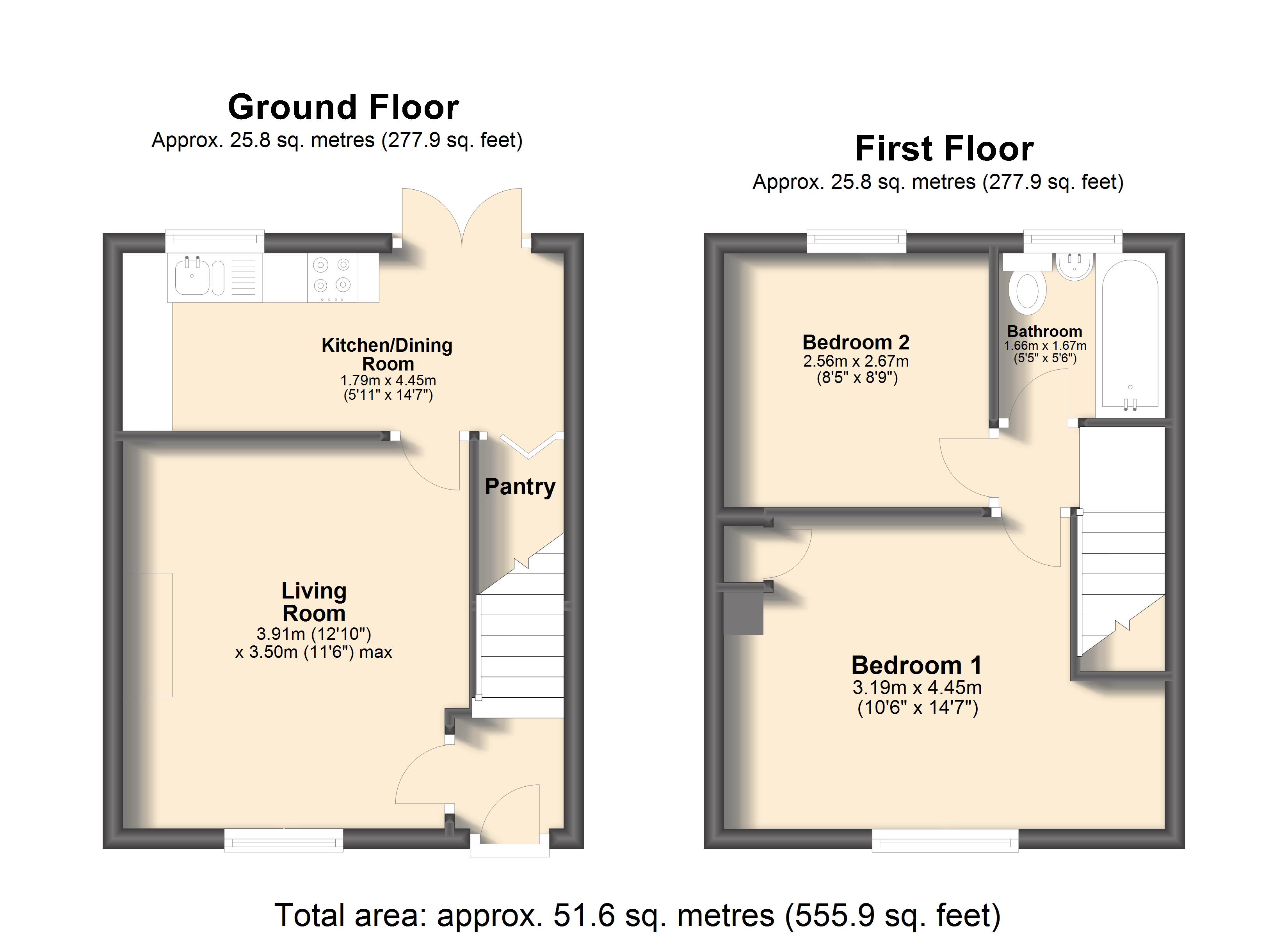 Upstairs, the home features two well-proportioned bedrooms, both offering plenty of room for stand-alone or fitted furniture. The bathroom is finished with a three-piece suite, completing the interior.