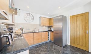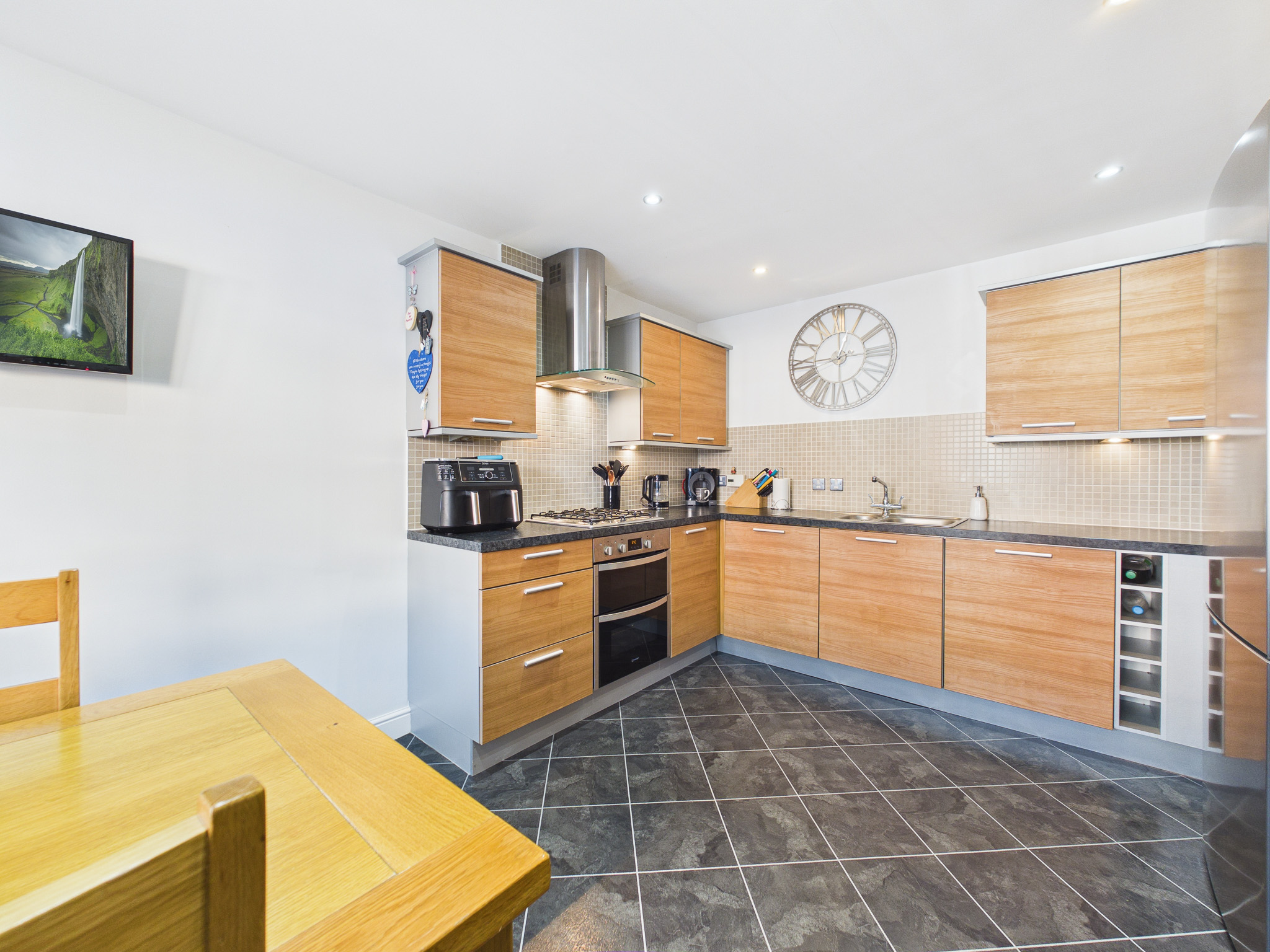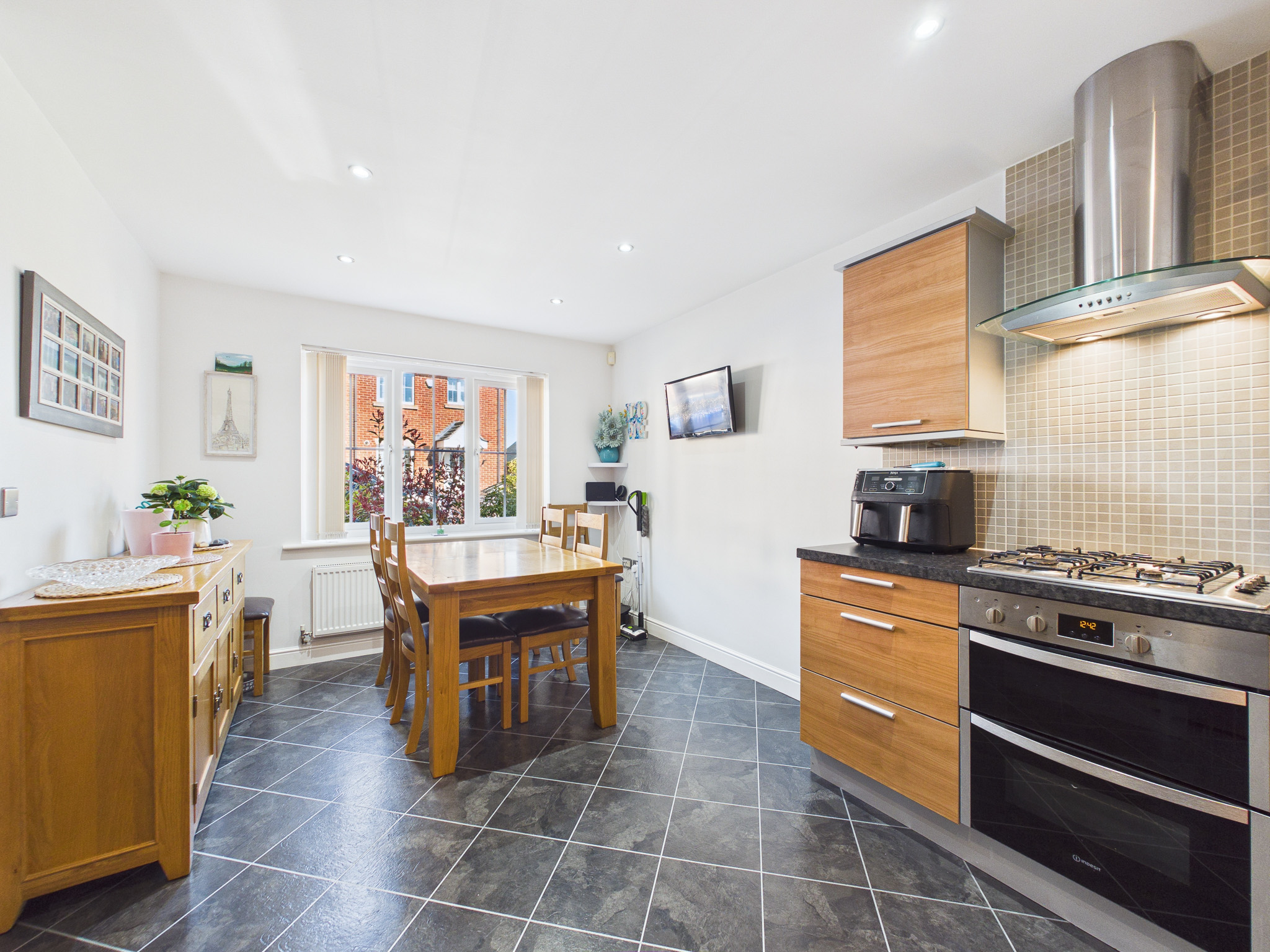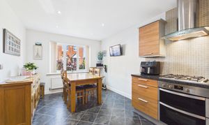 Upon entering, a bright and welcoming hallway with stylish wood-effect flooring leads to a convenient cloakroom/WC. The well-appointed dining kitchen features fitted cabinetry, integrated appliances and generous worktop space - perfect for everyday family life and entertaining alike. A dedicated dining area, illuminated by a large window, creates a warm and inviting atmosphere.