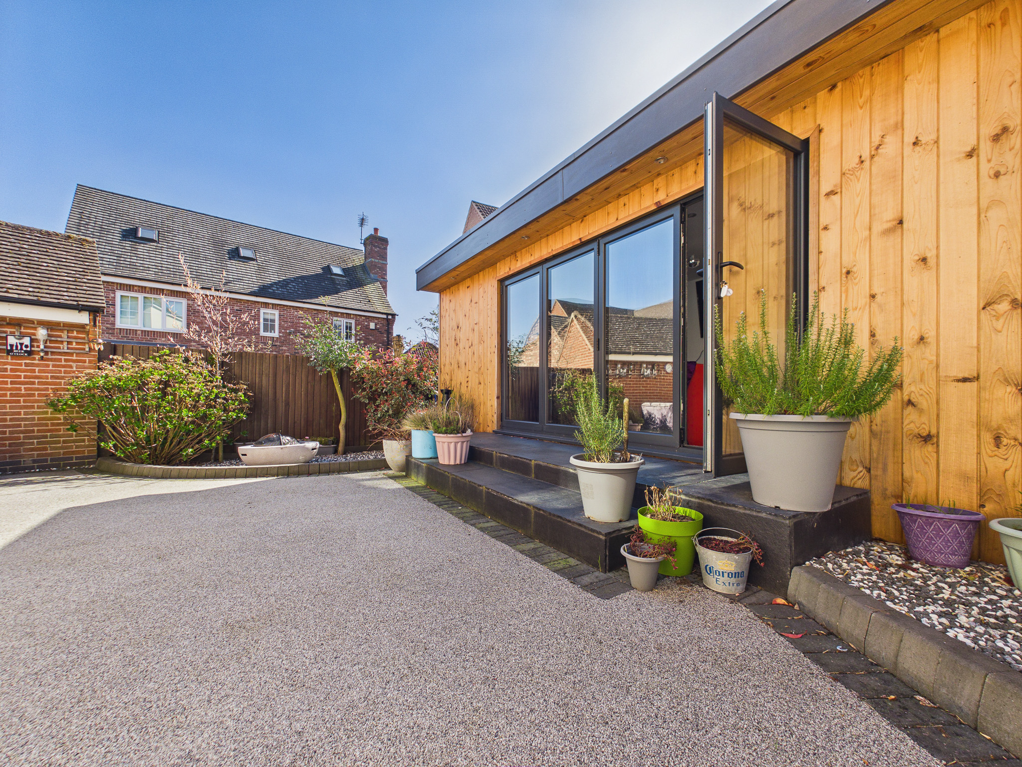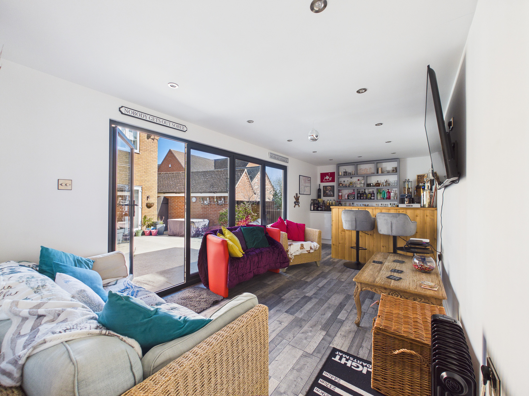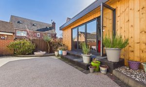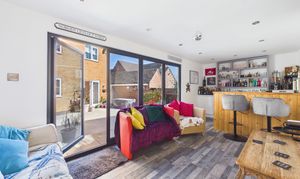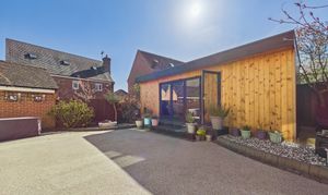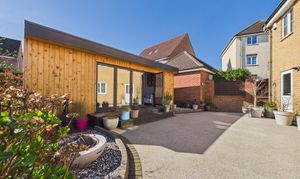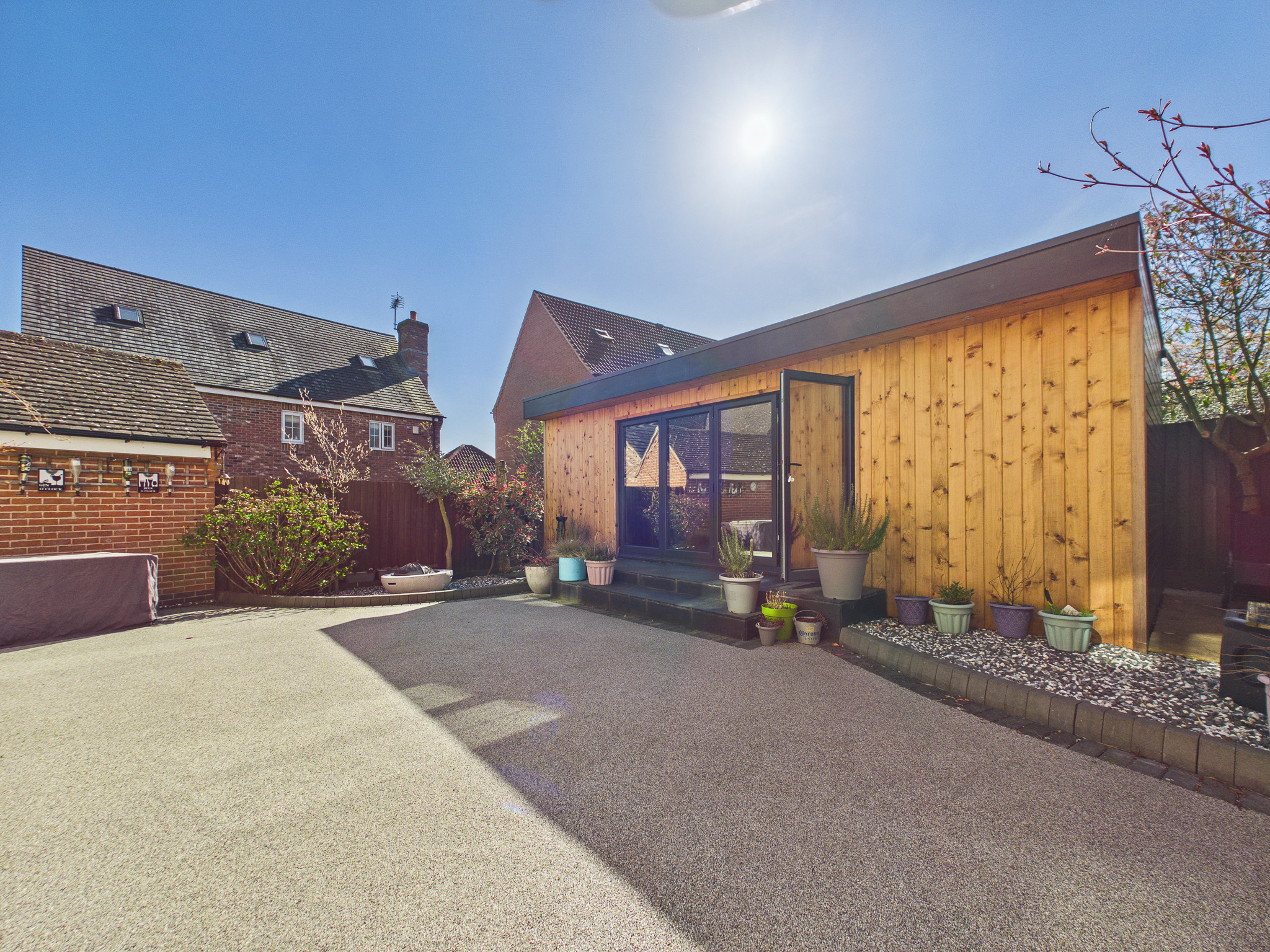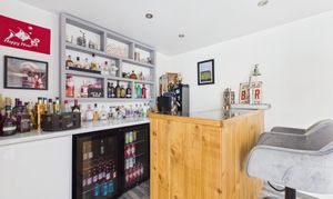 The rear garden benefits from being south-west facing and has been hard landscaped with low-maintenance resin-bound surfacing, offering ample space for seating and entertaining. Decorative planters, borders, and established greenery add character while maintaining a clean, contemporary feel. A standout feature is the impressive timber-clad garden room, currently transformed into a fully equipped bar/pub by the current owners. Finished with wood-effect flooring, inset lighting and a bespoke bar area with shelving and drinks fridges, this space provides a wonderful social setting. Expansive bi-fold doors open onto the garden. With power, a WC and versatile design, this room could also serve as a home office, gym or additional reception space.