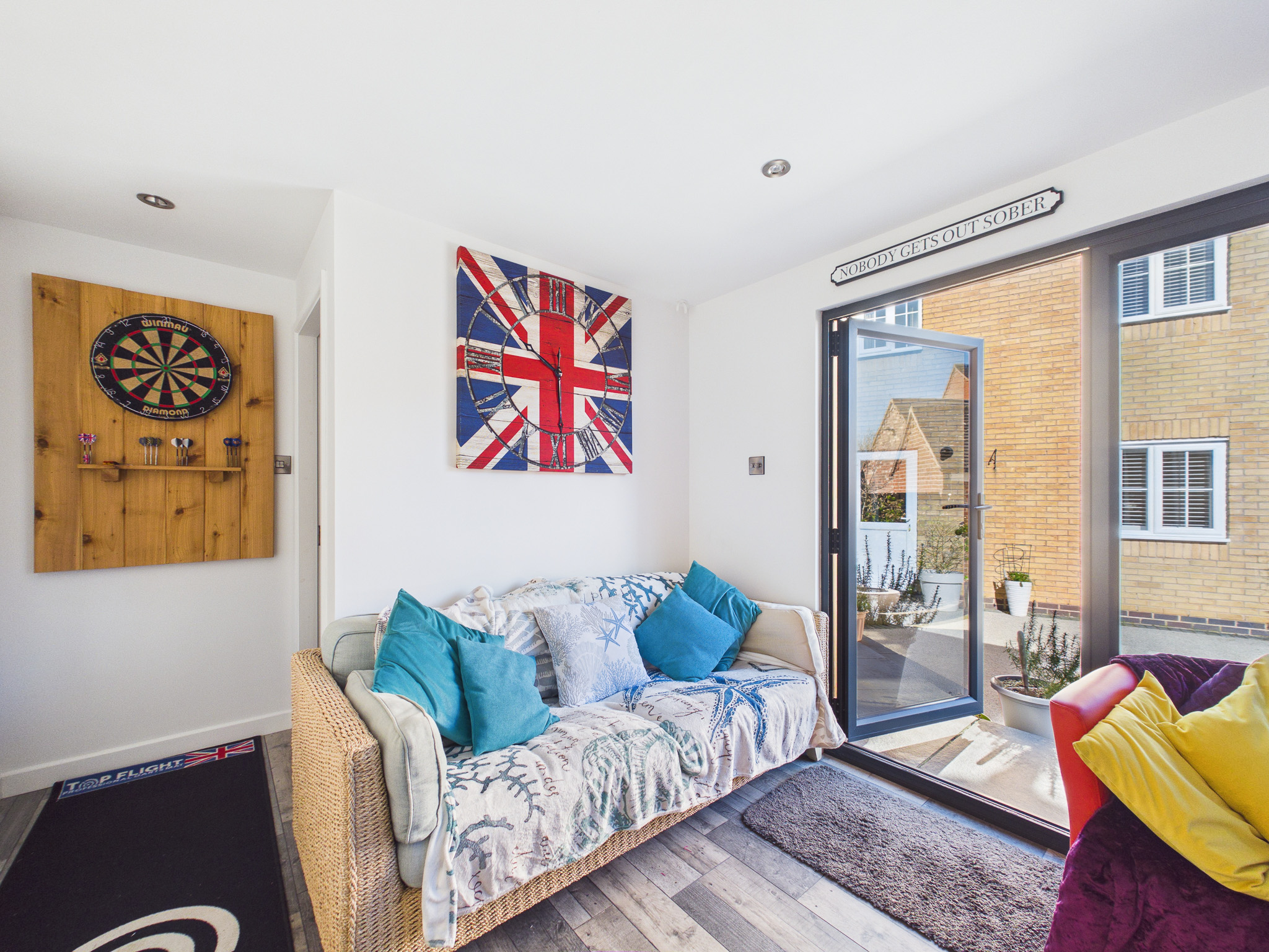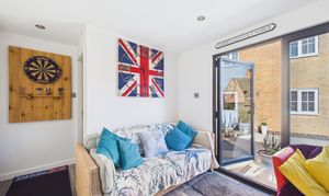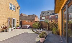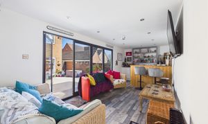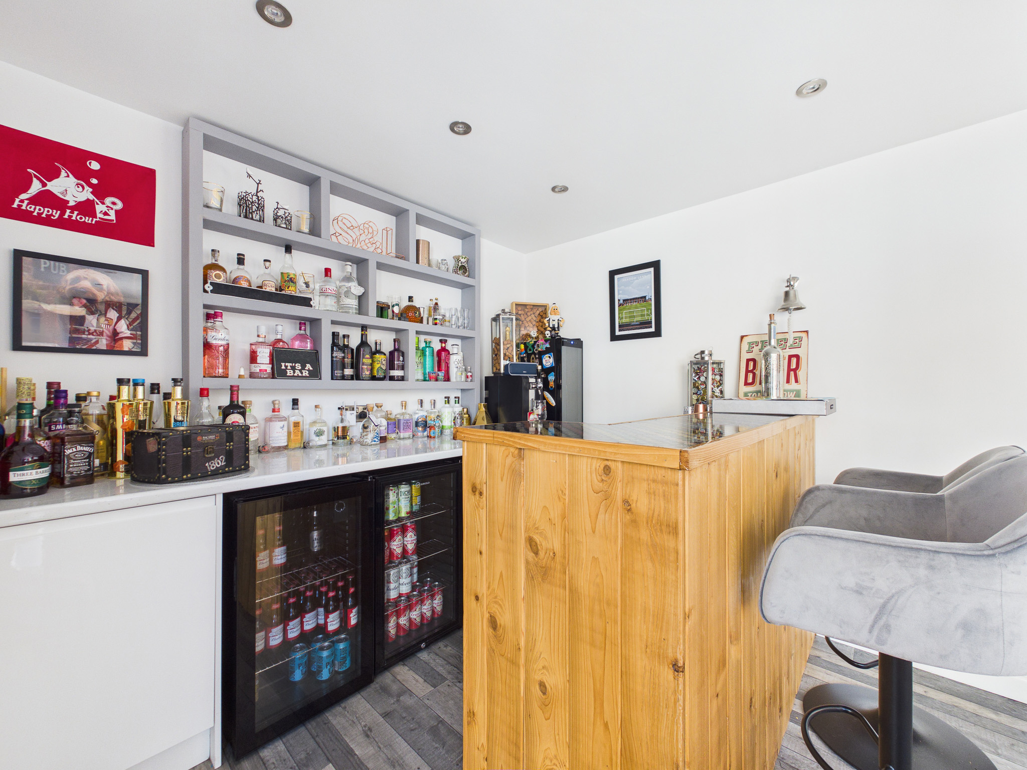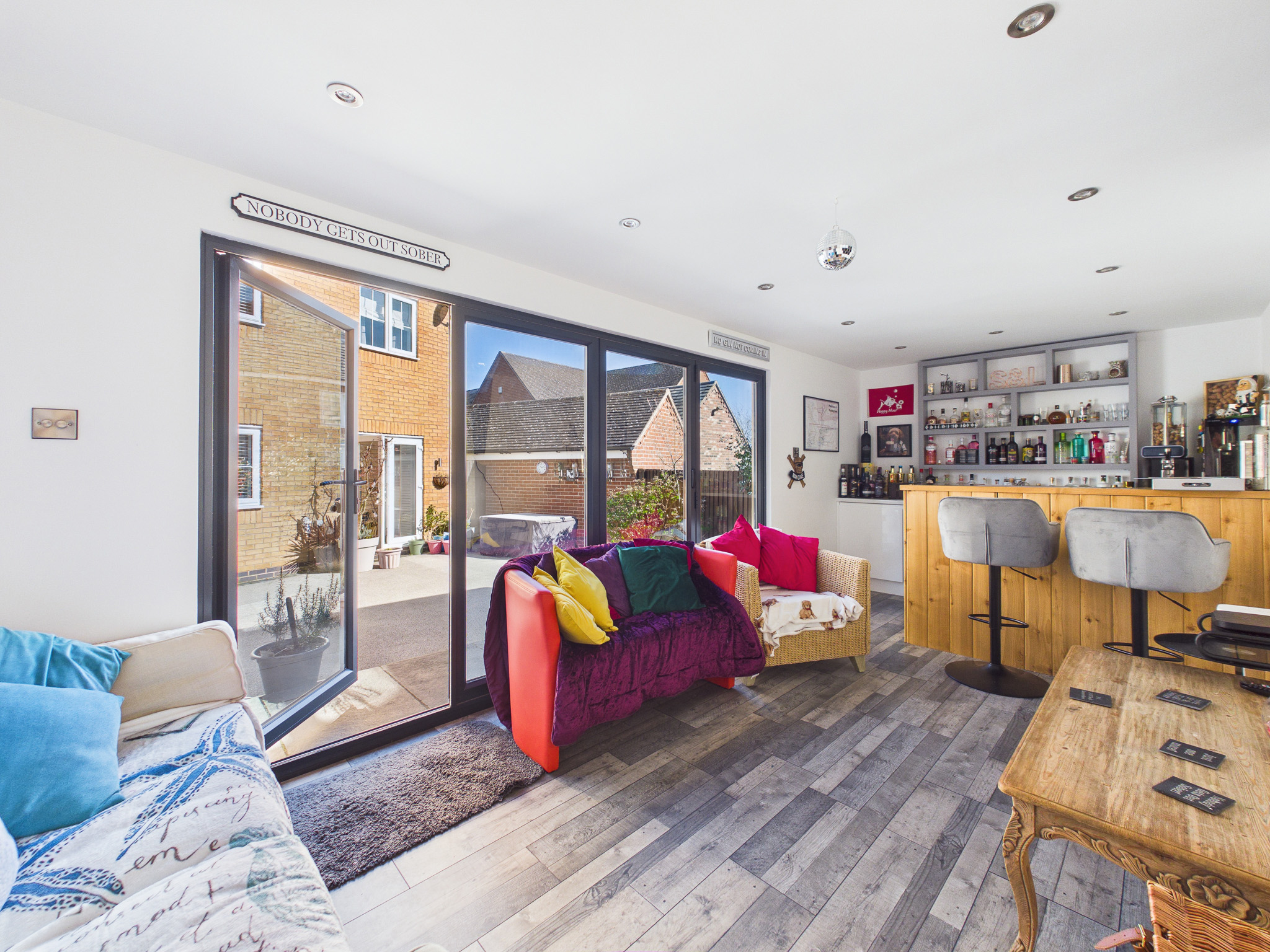 The rear garden benefits from being south-west facing and has been hard landscaped with low-maintenance resin-bound surfacing, offering ample space for seating and entertaining. Decorative planters, borders, and established greenery add character while maintaining a clean, contemporary feel. A standout feature is the impressive timber-clad garden room, currently transformed into a fully equipped bar/pub by the current owners. Finished with wood-effect flooring, inset lighting and a bespoke bar area with shelving and drinks fridges, this space provides a wonderful social setting. Expansive bi-fold doors open onto the garden. With power, a WC and versatile design, this room could also serve as a home office, gym or additional reception space.