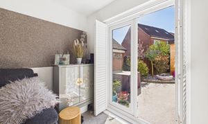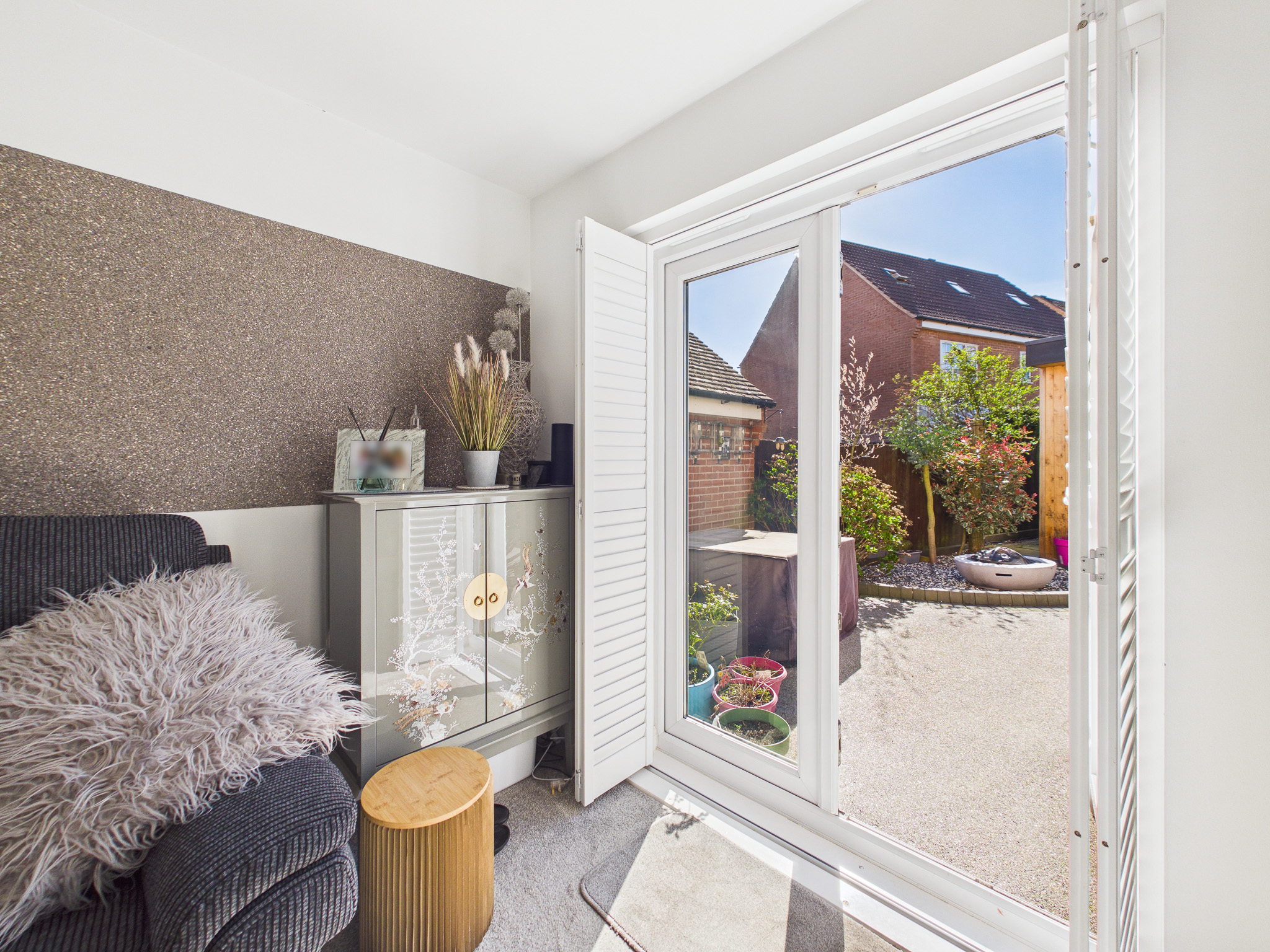 To the rear is a bright lounge providing an ideal place to relax, with French doors that open directly onto the garden, creating a seamless connection between indoor and outdoor living. Plush carpeting and carefully considered décor complete this stylish and comfortable space.