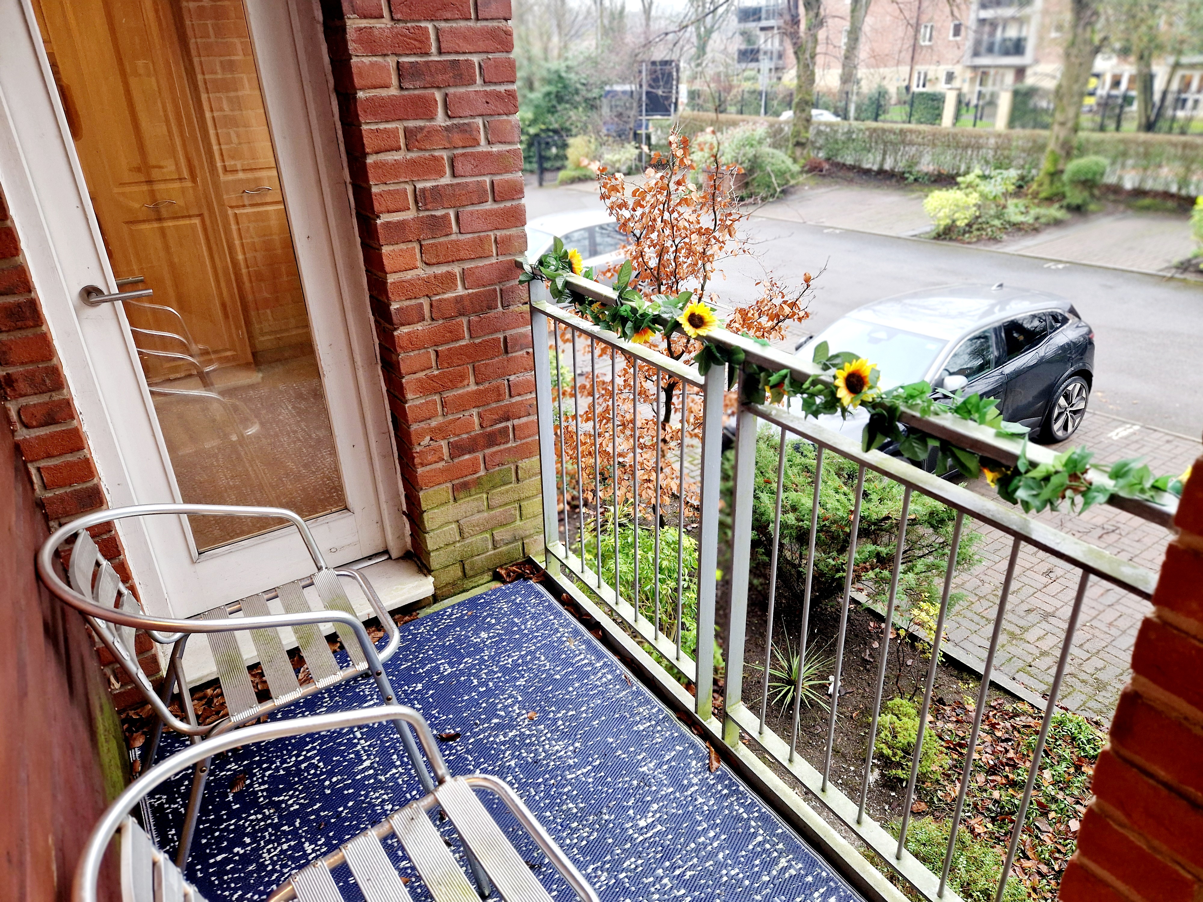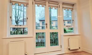 A bright and spacious room with windows to the front, side, and rear, offering flexibility for furniture placement. The room extends to a balcony.
