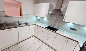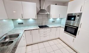 Equipped with white gloss wall and base units, an inset 1.5 sink unit with a mixer tap, integrated oven, microwave, hob, extractor hood, and integrated dishwasher and fridge/freezer. Tiled walls and splashbacks.