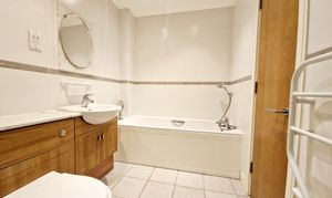 Featuring a white suite with a bath, shower attachment, washbasin, and wc. Tiled floor and walls, along with an extractor fan.