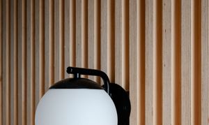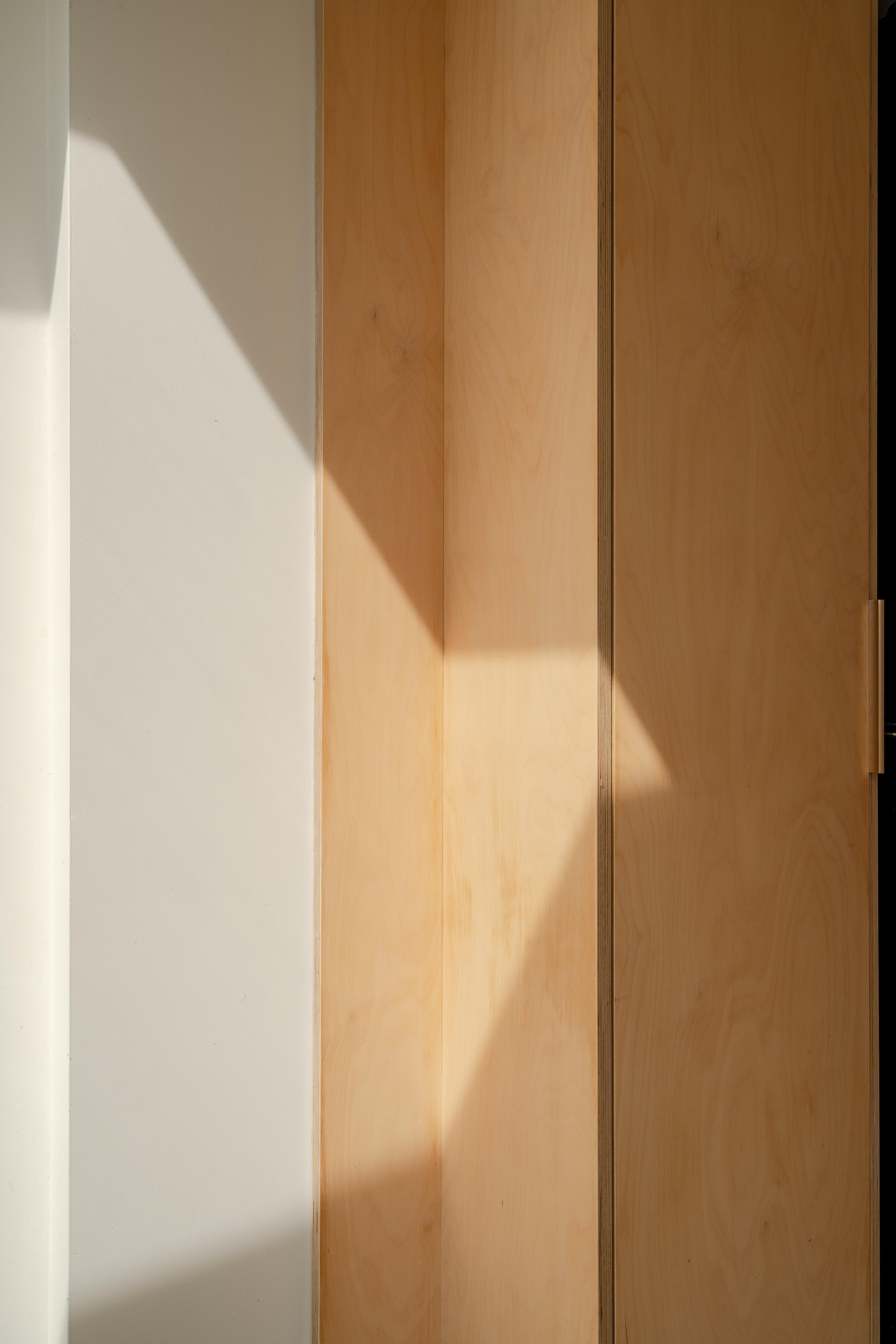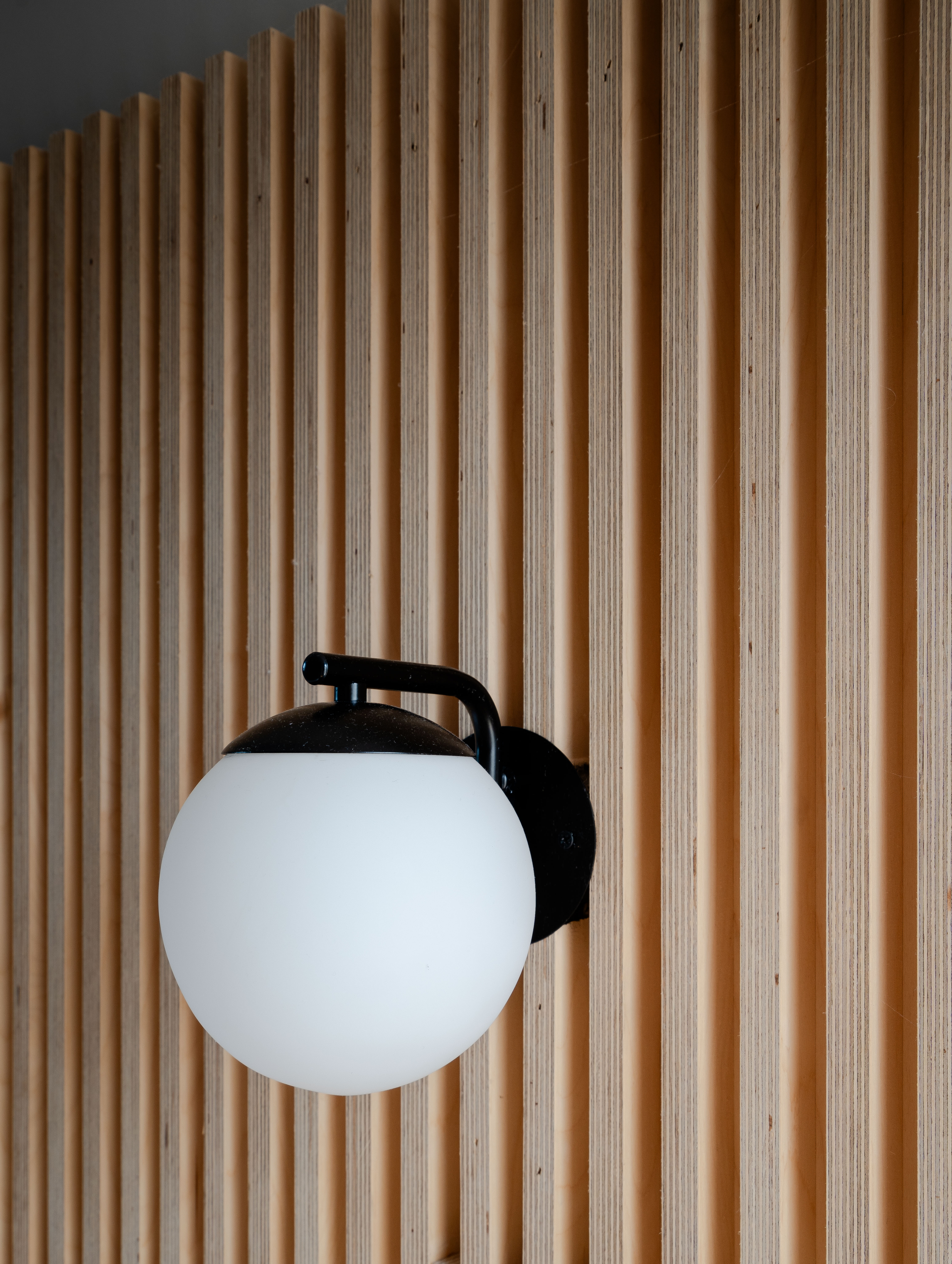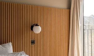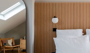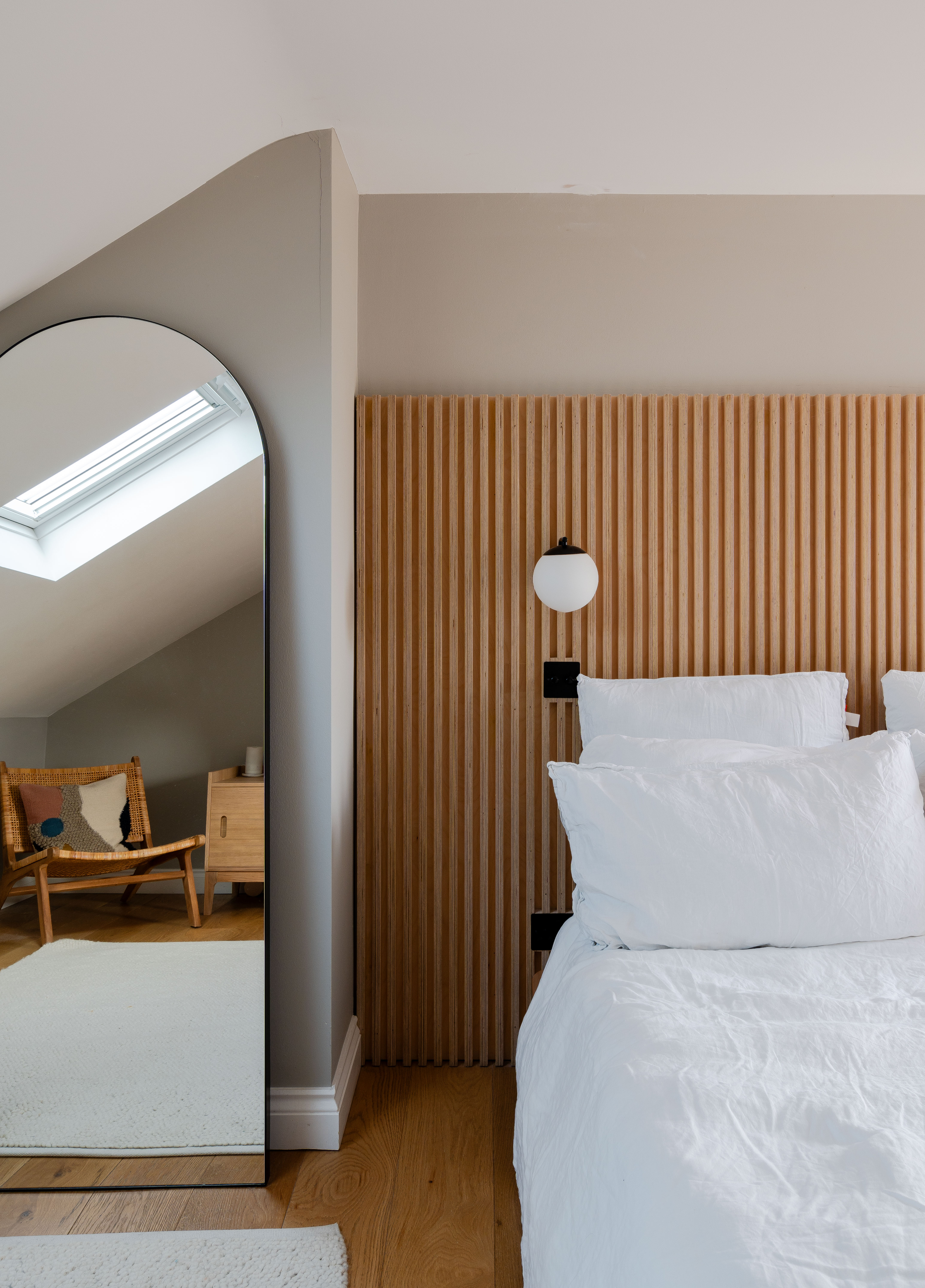 Take a second matching staircase to the cleverly configured loft suite, where a skylight on the landing draws light down to the heart of the home. Soft white walls combine with wide plank oak engineered flooring for a stylish Scandi feel, echoed by a wall of bespoke ply panelling in the loft bedroom, which acts as a headboard and is fitted with globe bedside wall lights.