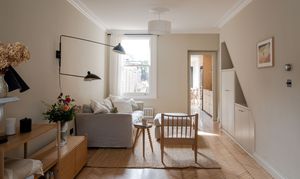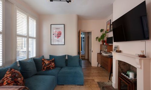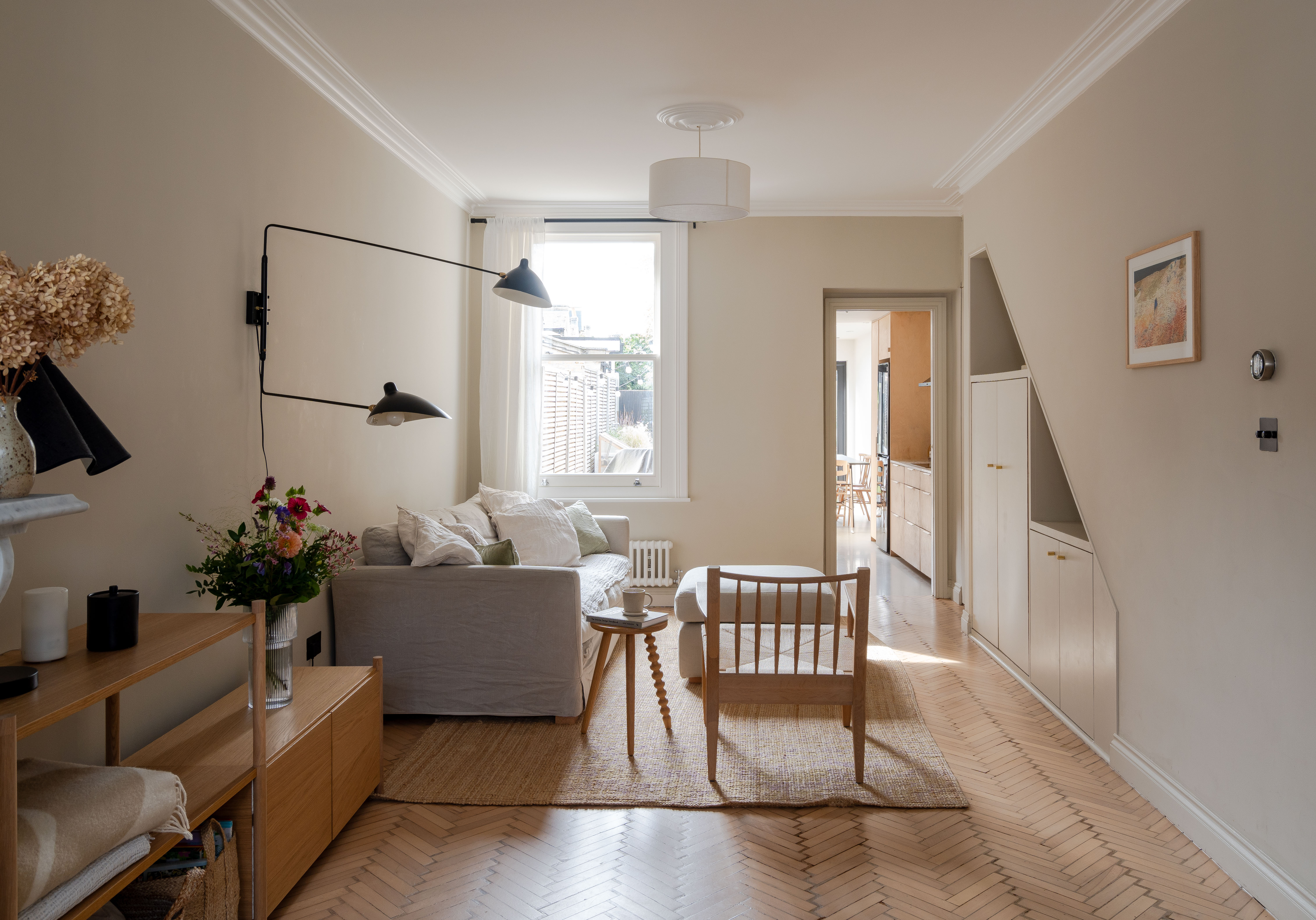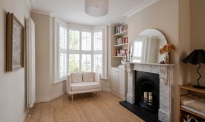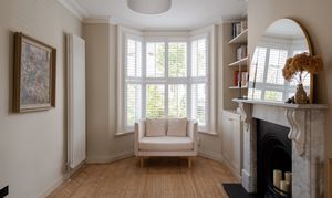 A door to your left leads to a dual-aspect lounge lit by a front-facing bay with tier-on-tier louvred shutters and a tall garden-facing sash to the rear. The walls here are painted in Farrow & Ball ‘Shaded White’, selected to complement the north/south dual aspect, while handmade plaster coving and roses with pendant fittings grace the high ceilings. A pair of column-style radiators keep things toasty, while the characterful reclaimed herringbone parquet flooring has been finished with a natural varnish.