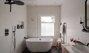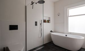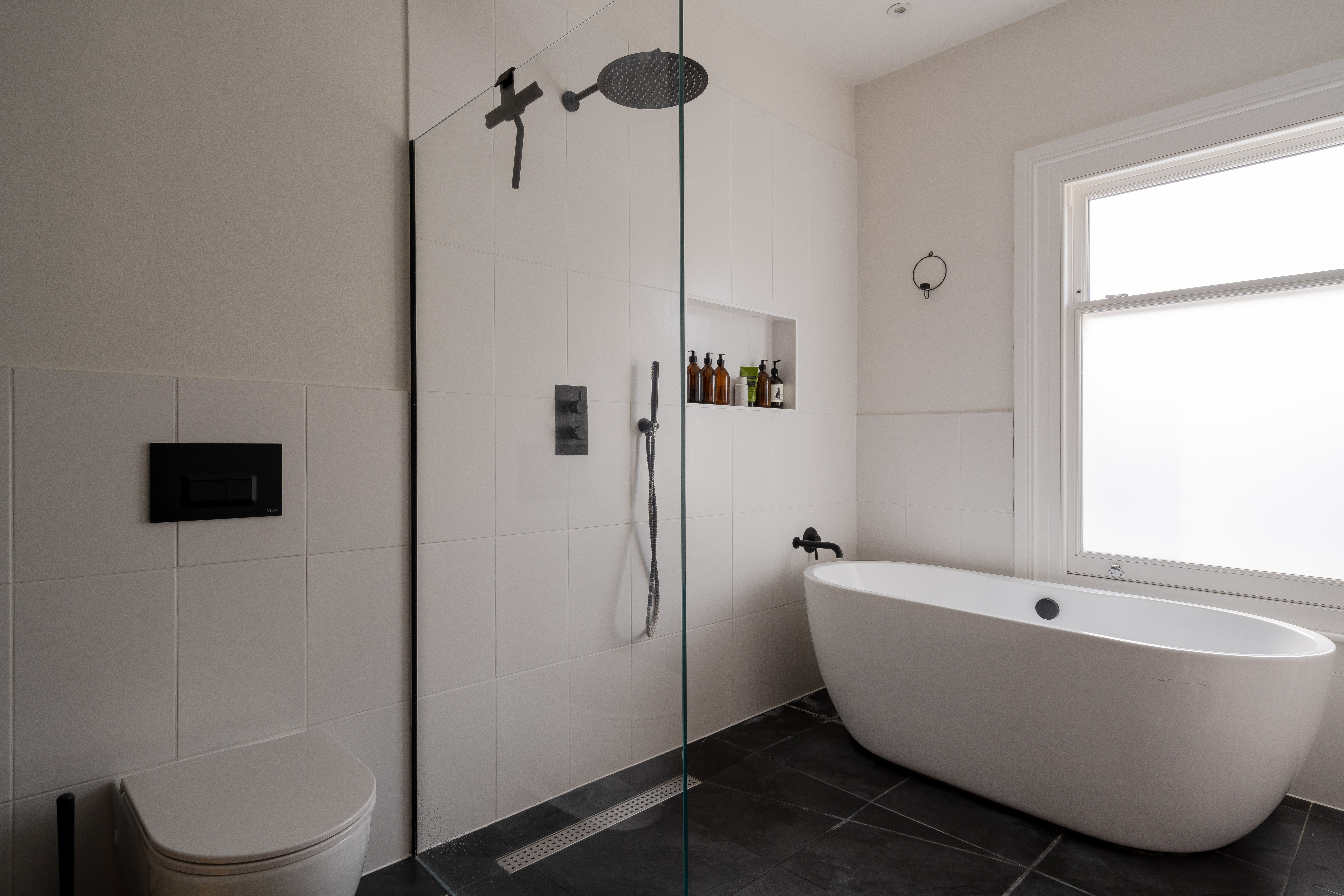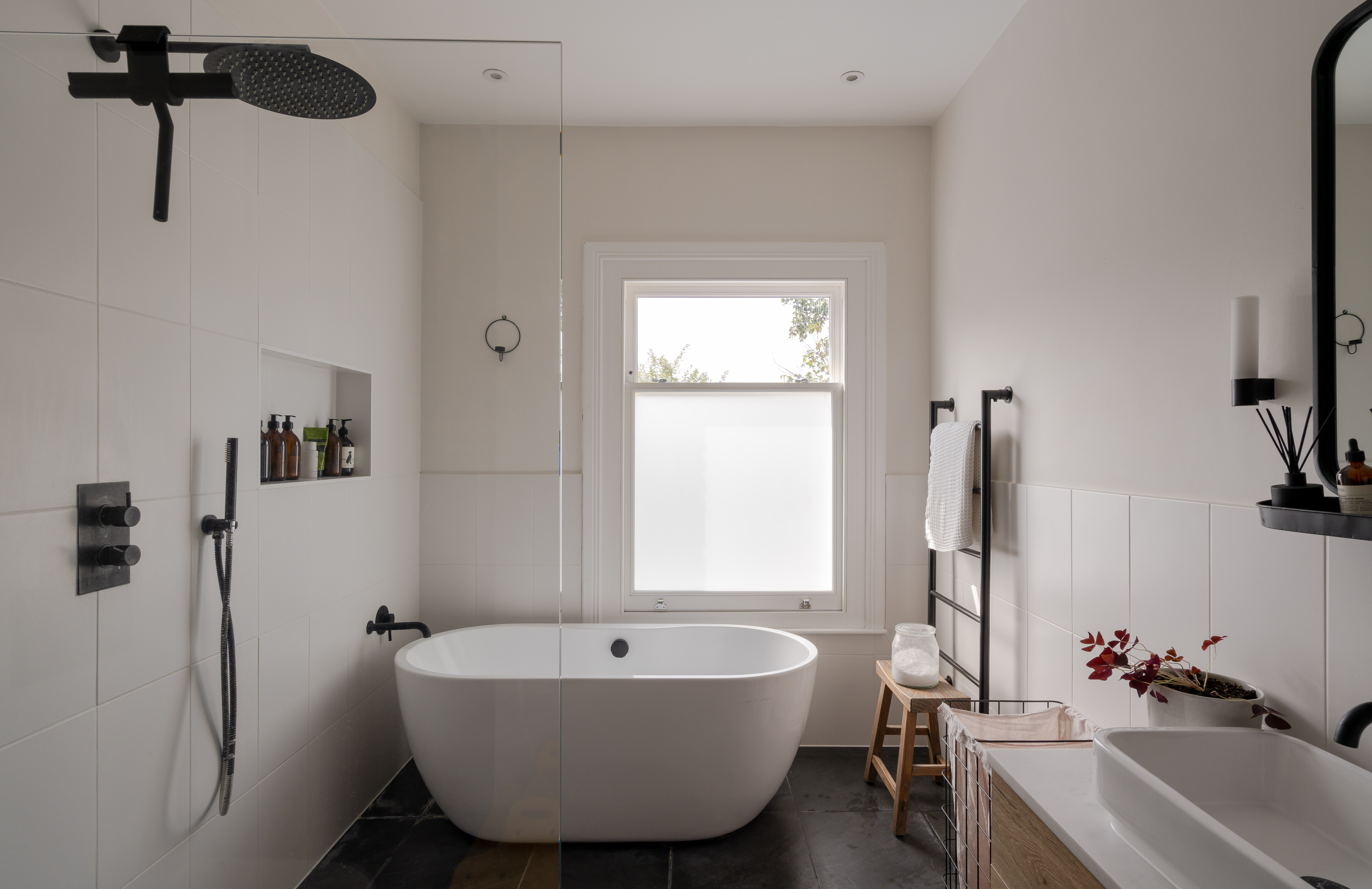The spacious family bathroom lies at the rear, where matt-white wall tiles and a charcoal-tiled floor create the backdrop for a luxurious walk-in wet-room-style waterfall shower with custom frameless glass screen, toiletry niches and black fittings. A separate handheld attachment serves the shower and a showstopping freestanding bath with matt black taps beneath a wide frosted sash window.