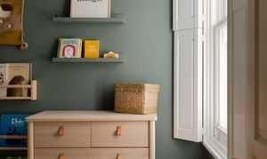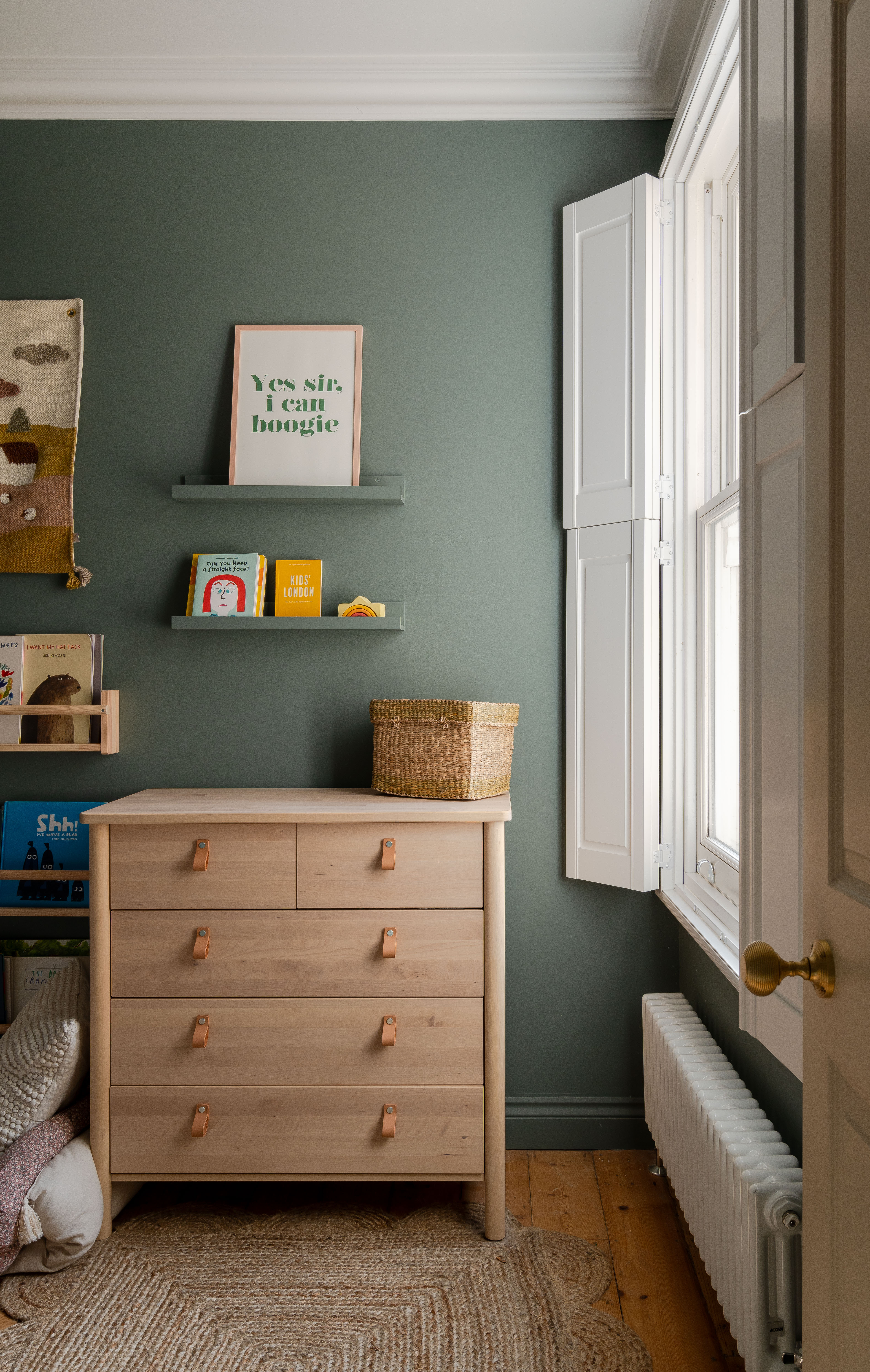 Beyond, you’ll find the second bedroom. Another good-sized double, it’s painted in ‘Livid’ by Little Greene and looks out on the garden through a tall sash window – again fitted with solid timber shutters and a column-style radiator beneath.