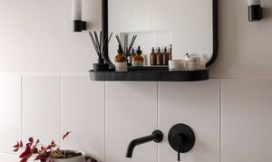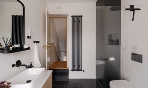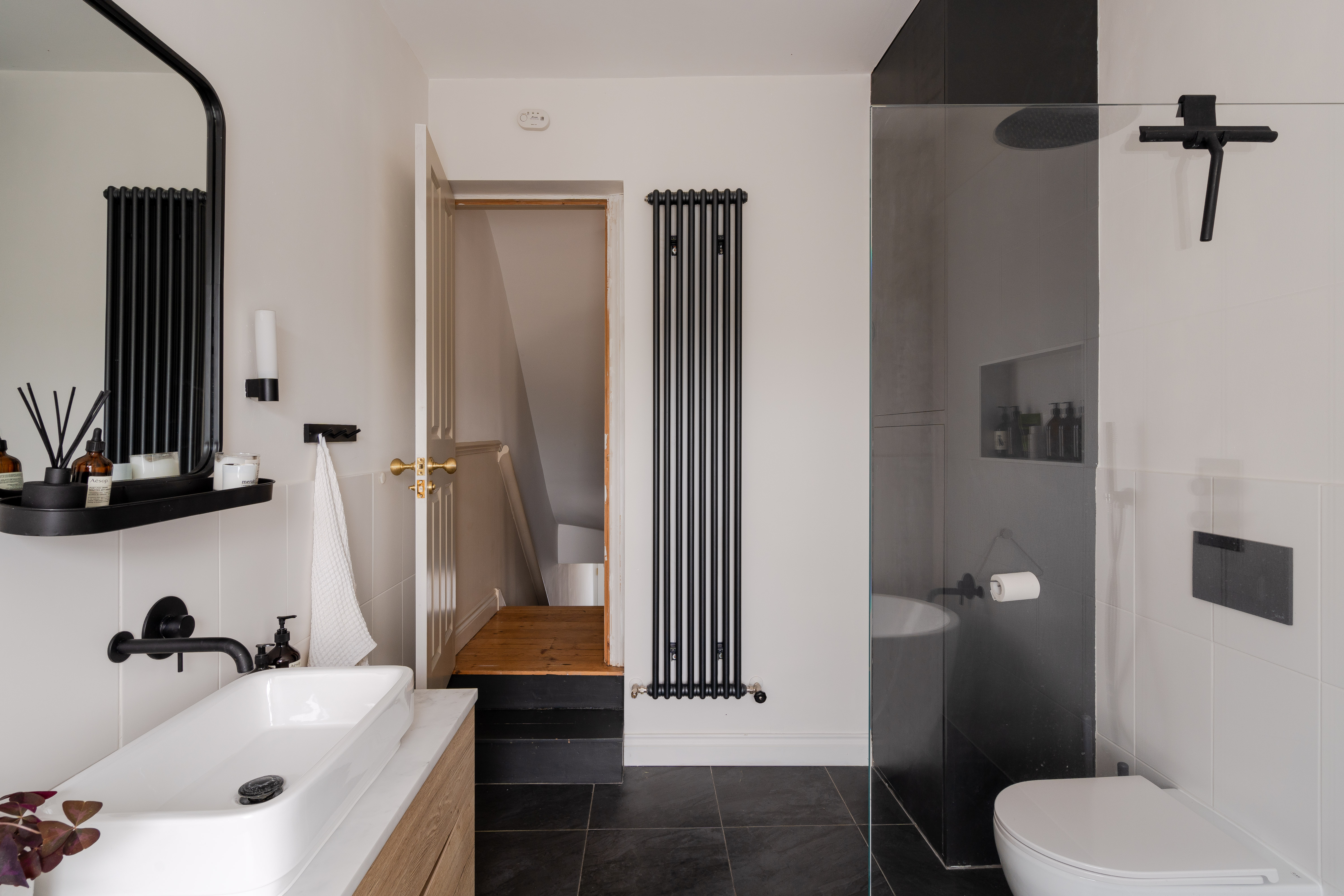 The suite is completed by a marble-topped Crosswater vanity with a wide sink, wall-mounted tapware, and a concealed cistern RAK loo. Further details include a dedicated heated towel rail, a black column-style radiator, and contemporary black wall lights framing the vanity mirror. The Vaillant Green IQ EcoTech boiler, fitted in 2019, is also housed here, hidden away inside a useful storage cupboard.
