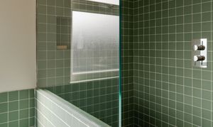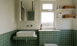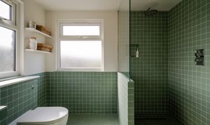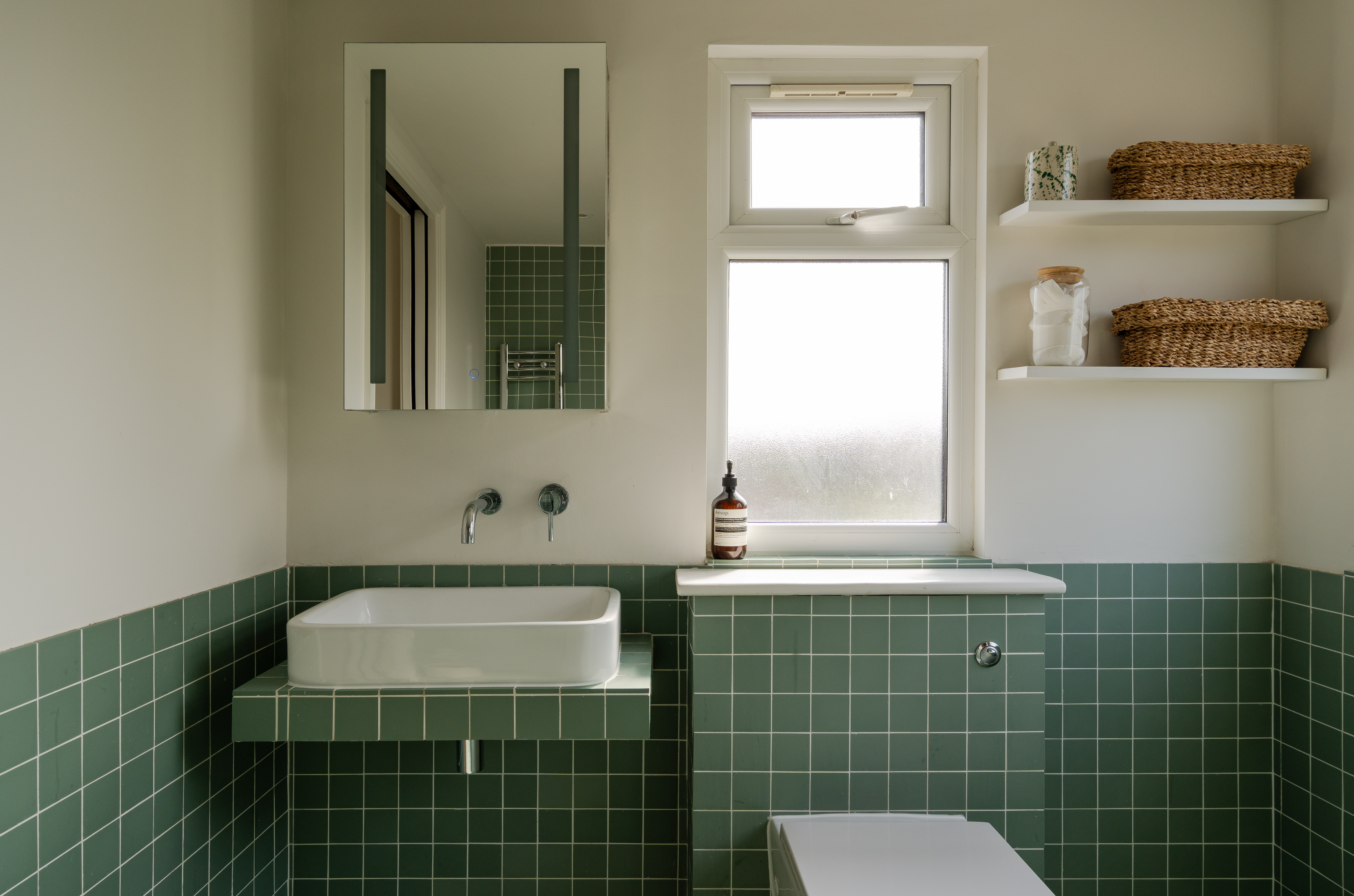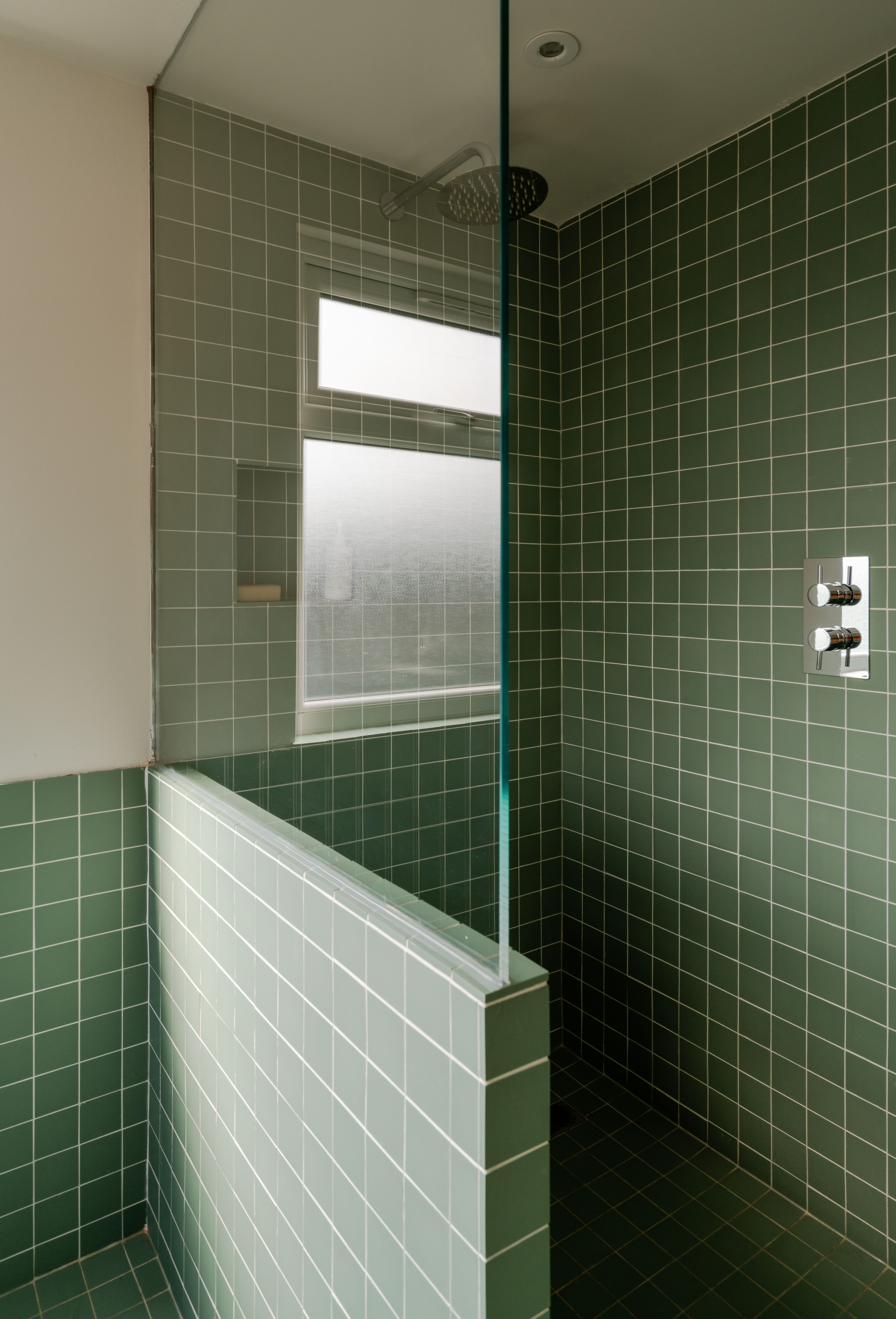 Featuring a wet-room-style walk-in waterfall shower with partial glass screen, a RAK concealed cistern loo, and a countertop basin with an overhead mirrored unit, the bathroom's walls and floor are tiled in fabulous pale green Winckelmans tiles, a nod to the Victorian hallway downstairs.