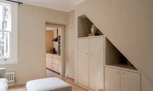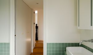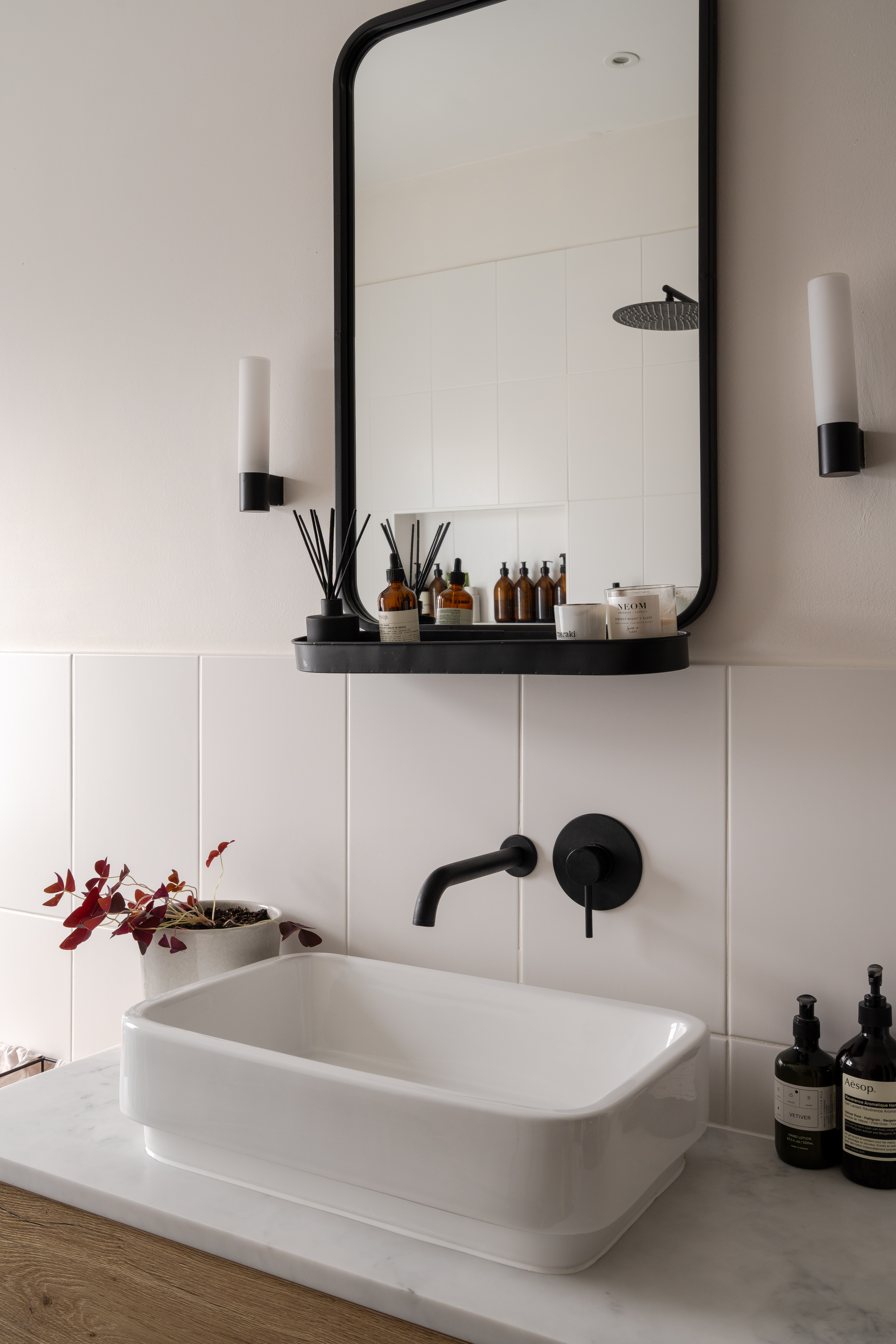 Enhanced by an expertly curated calming palette of Little Greene and Farrow & Ball shades, period features such as Victorian hallway tiles and floorboards were brought back to life, and ceiling coving and fireplaces (sympathetic to the originals) were reinstated. Four-panel fire-rated doors with satin brass beehive doorknobs have also been fitted.