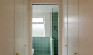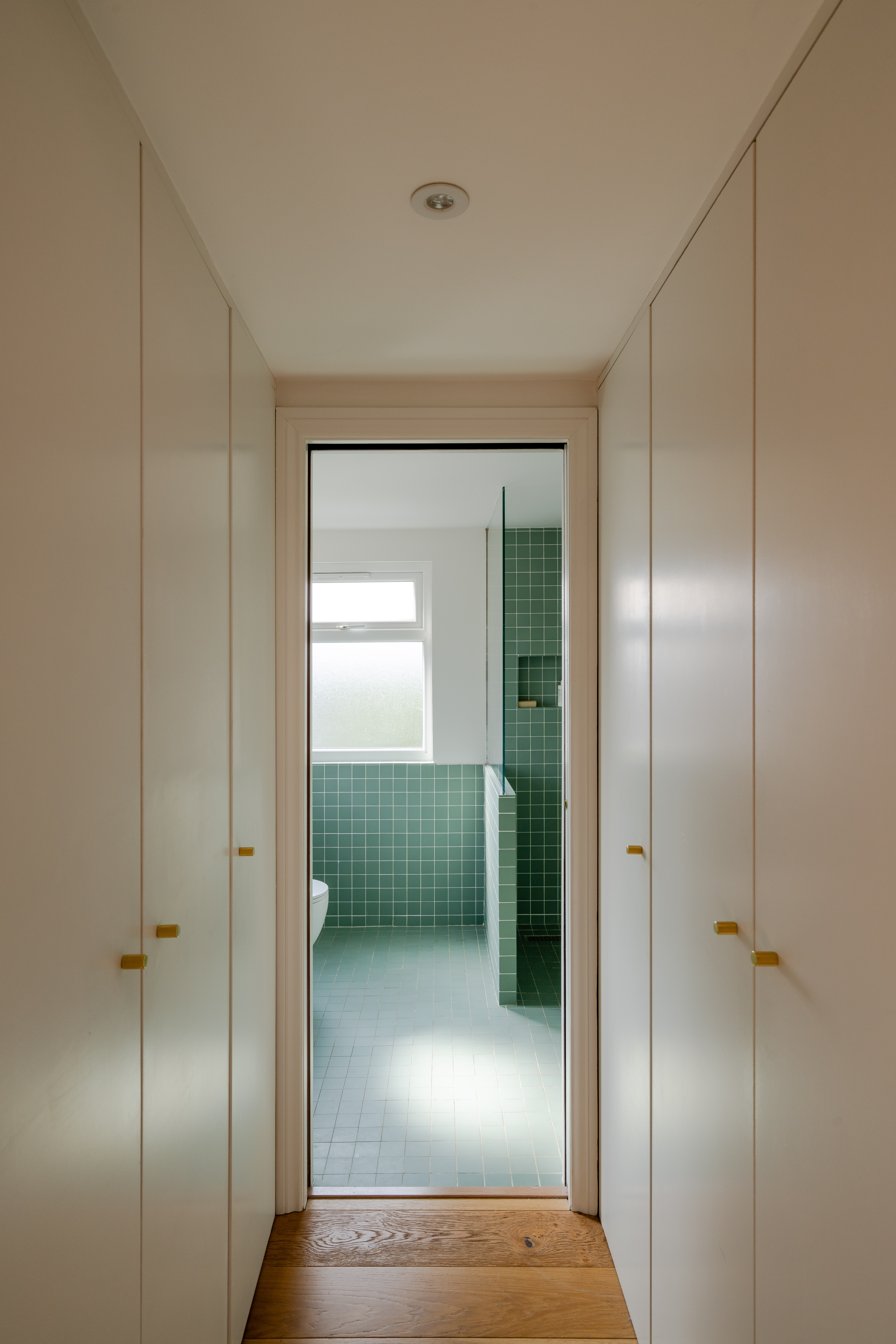 A roomy walk-through wardrobe and dressing area with bespoke cabinetry and knurled brass handles leads through a pocket door to the second bathroom, lit by a pair of frosted casement windows.