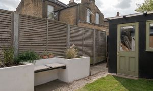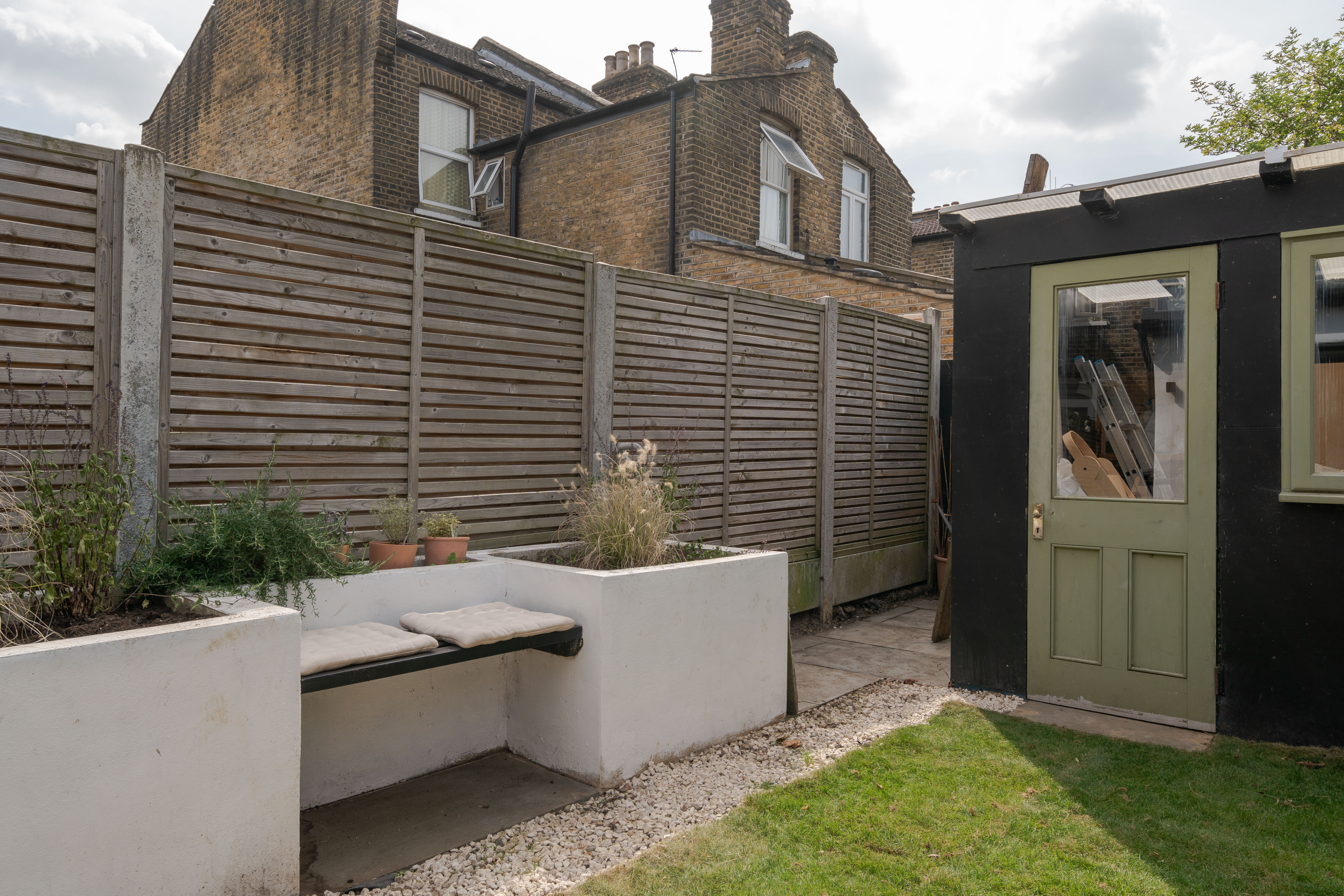 The south-facing garden extends to 25ft, and enjoys the sun for most of the day, from mid-morning onwards. Enclosed in slatted timber fencing, a sawn-edge grey Kandula sandstone patio steps up to a grassy lawn, edged with twin rendered planters and a bench with an inbuilt herb garden. Other plants include climbing jasmine, euphorbia, purple salvia and rosemary.