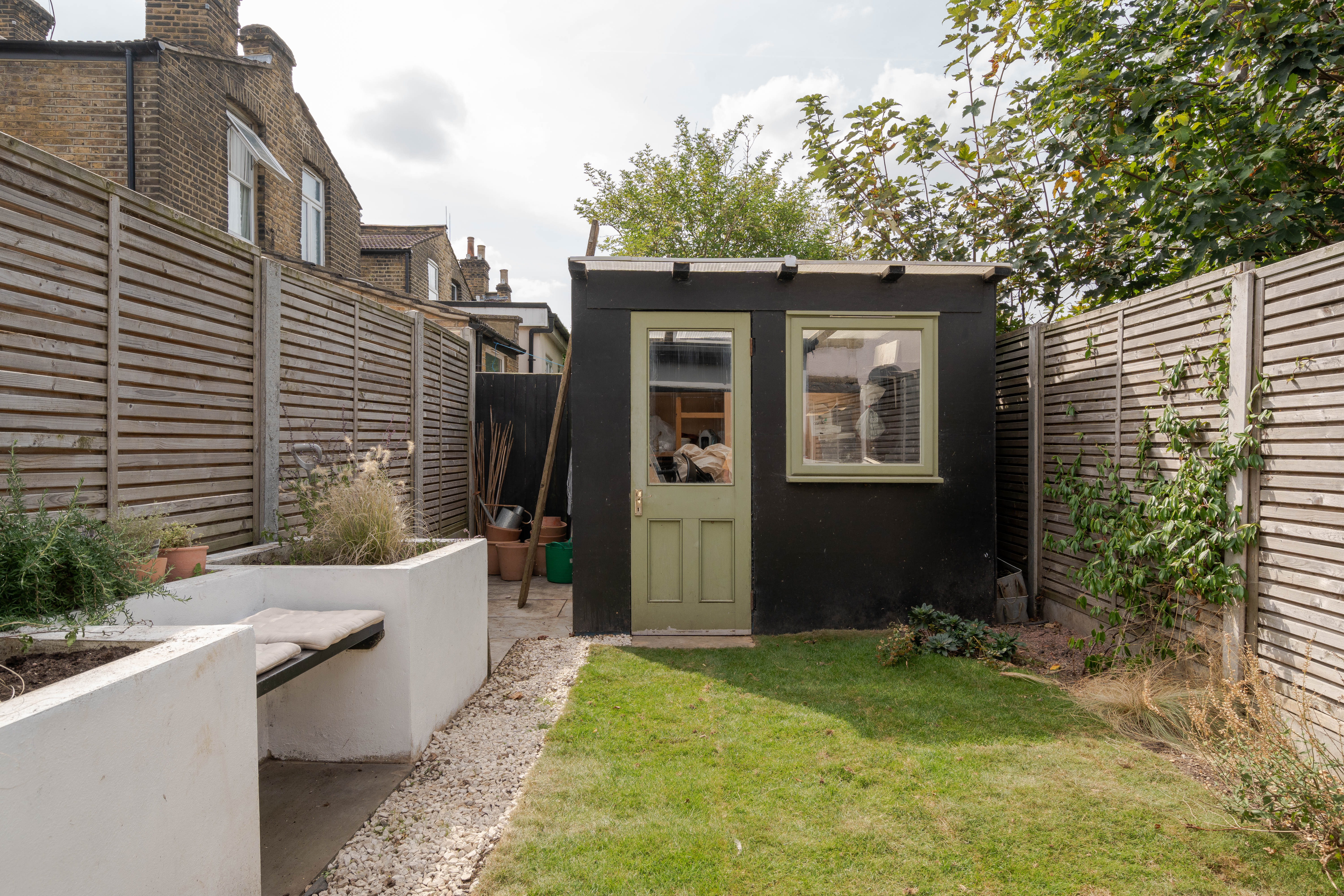 To the rear is a further area of sandstone – ideal for bikes, storage or a barbecue –and an airy workshop with painted walls, a casement window, engineered wood flooring and power. Currently used as storage, it could be a brilliant home office, playroom, exercise or studio space.