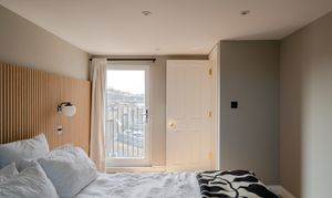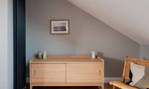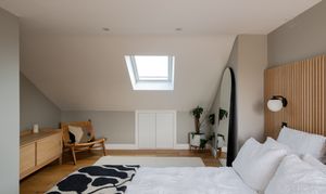 With rooftop views to the rear through an anthracite grey uPVC French door with a Juliet balcony and further light flooding in from a large front-facing Velux, the bedroom is both peaceful and practical, with soft blue-grey walls, a tall black column-style radiator, and discreet access to useful eaves storage.