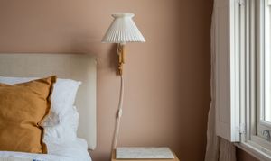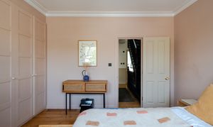 There’s another statement cast-iron fireplace, contrasting with the pink walls, painted in ‘’Fresh Plaster’ by Craig & Rose, and a white ceiling with reinstated coving. Integrated full-height wardrobes provide ample storage, and there’s also a central pendant light fitting.