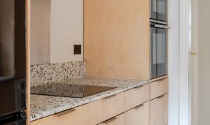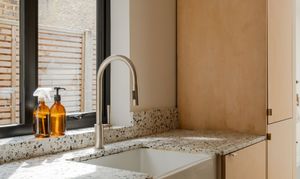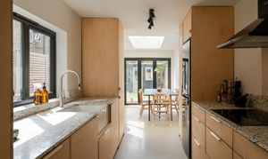 Step down and through an Eclisse pocket door into the dining kitchen, featuring contemporary IKEA units with bespoke ply-fronted cabinetry and stain brass handles, topped by a fantastic monochrome Diespeker & Co terrazzo worktop and upstand.
