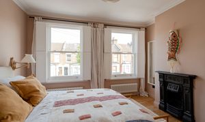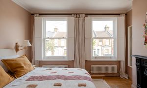 The primary double to the front is a calm and peaceful space that runs the full width of the house. A pair of horizontal column-style radiators sit beneath a pair of sash windows fitted with solid timber shutters for maximum room darkening at bedtime.