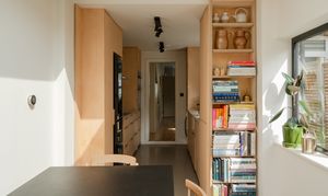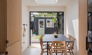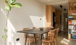 With crisp white walls, the room is bathed in light from side-facing anthracite aluminium casement windows, a large skylight over the dining area and tri-fold doors opening onto the garden. In winter, underfloor heating – with its own Nest thermostat – warms the grey poured-resin floor, which is easier to clean and more forgiving than concrete.