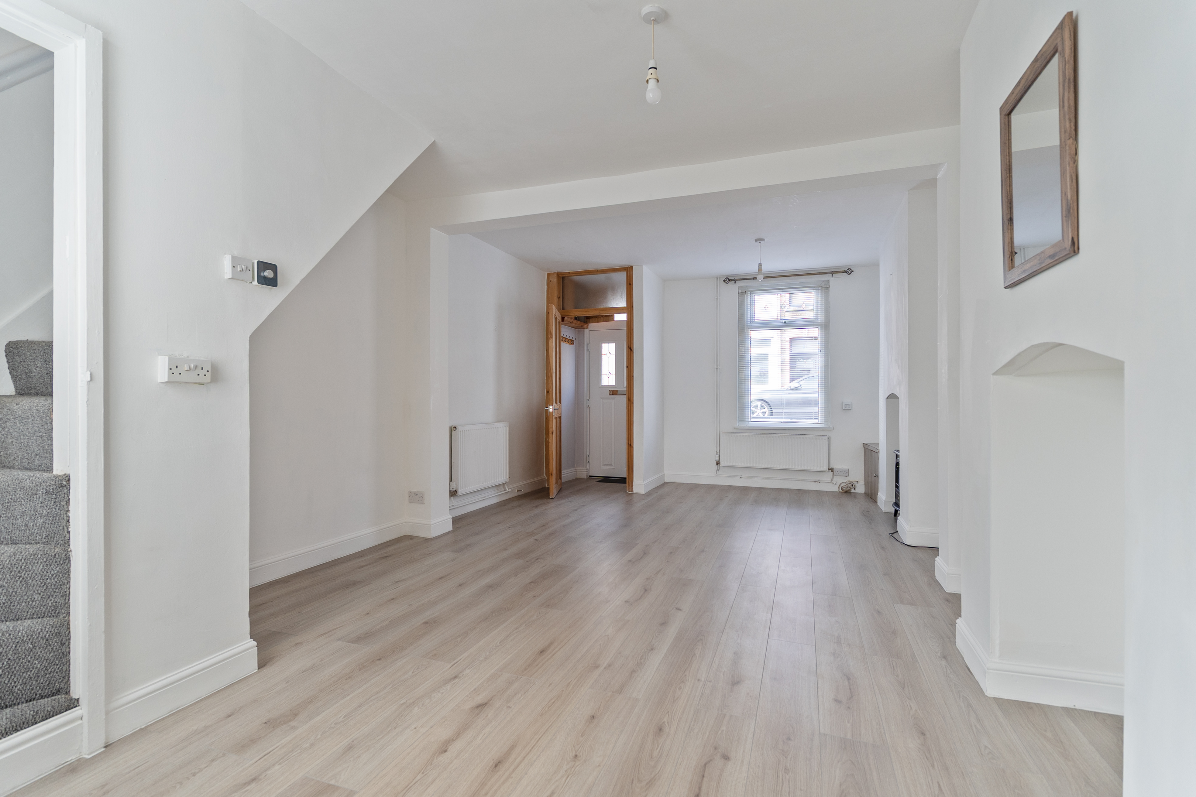 You enter the property through an initial hallway, which leads into the main living space. The ground floor features a bright and well-presented open plan lounge and dining room, characterised by tall ceilings and offering a spacious and versatile layout, with access to the staircase leading to the first floor. To the rear is the kitchen, which provides good storage and workspace and leads through to the bathroom and a large utility area, offering additional practicality and space for appliances. The utility area also provides access out to the rear garden.