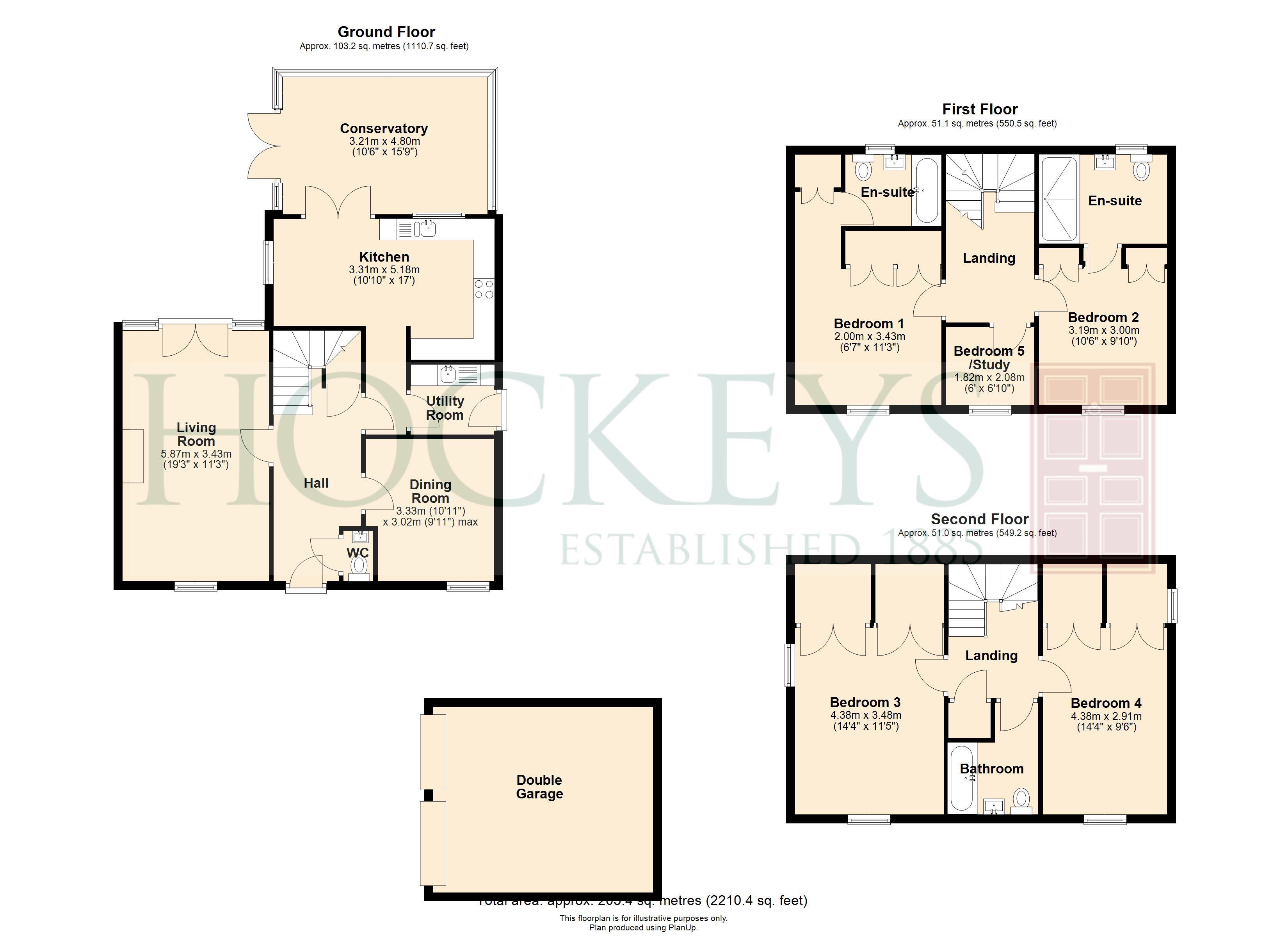 The first floor comprises two large double bedrooms, and a third single room/study. The Master bedroom offers three deep built in wardrobes and has an ensuite bathroom with half tiled walls. The second bedroom is also a generous double with two built in wardrobes and an ensuite shower room. On the second floor there are two further double bedrooms - both with two built in wardrobes.