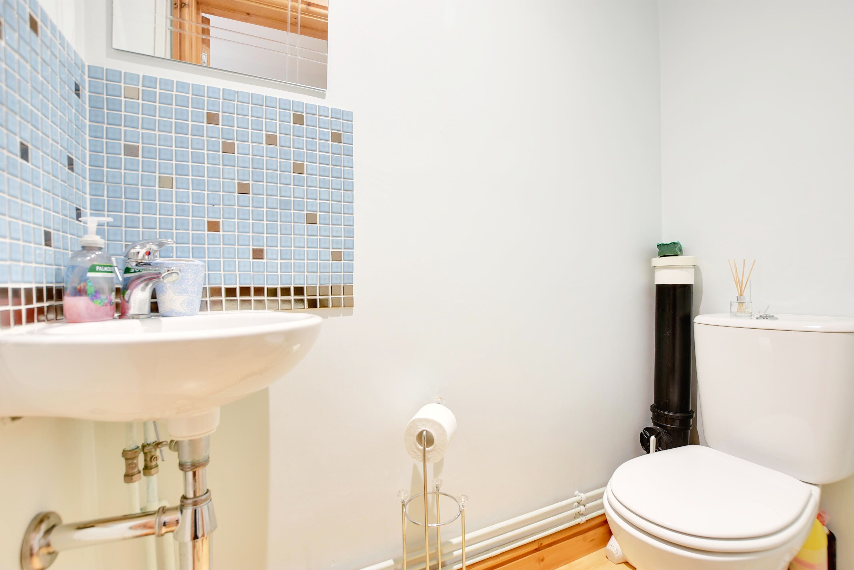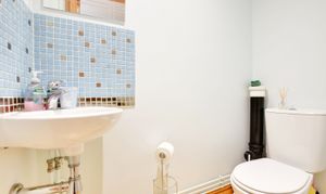 With low-level WC, wash hand basin, laminate floor.