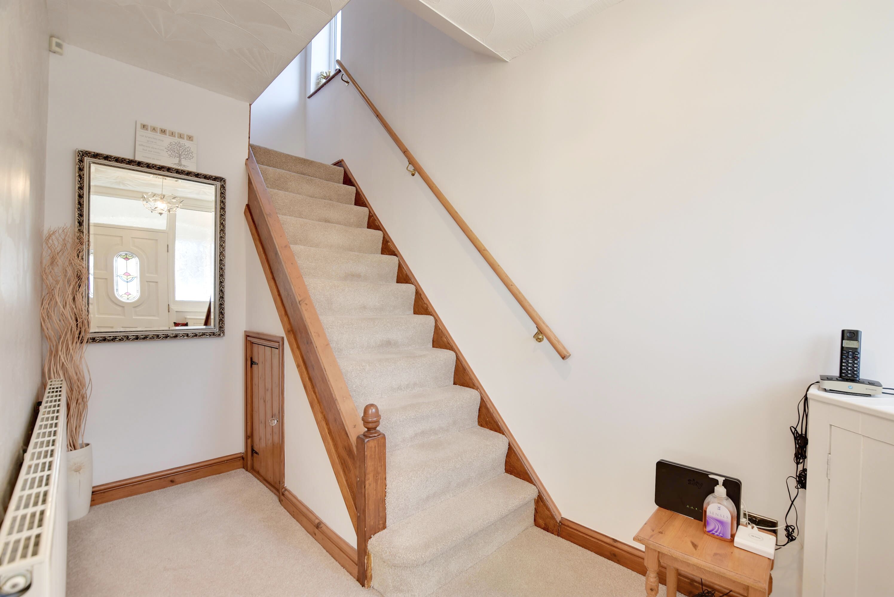 With stairs to first floor, alarm panel, meter cupboard, radiator.